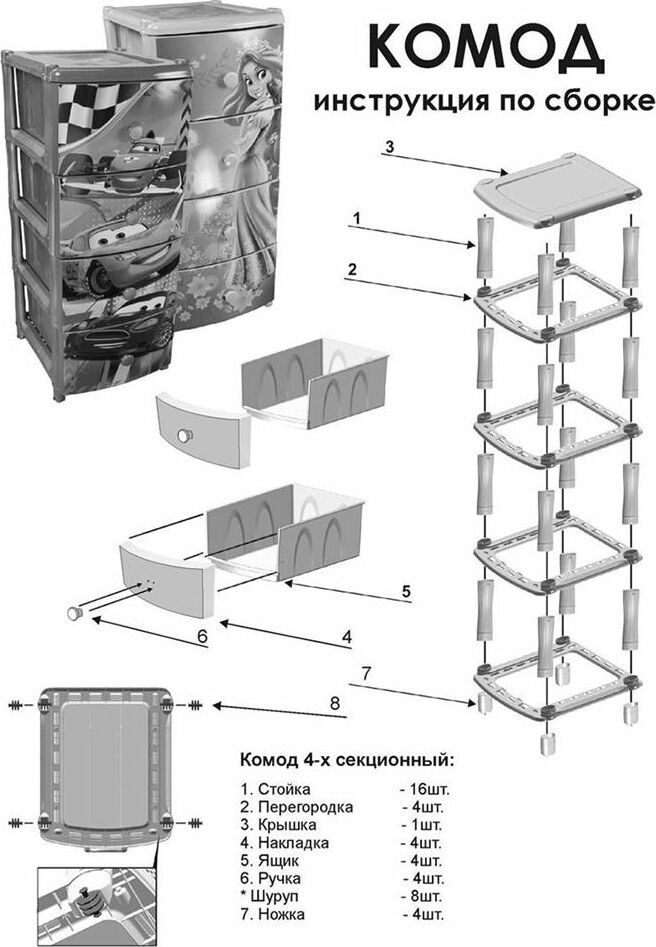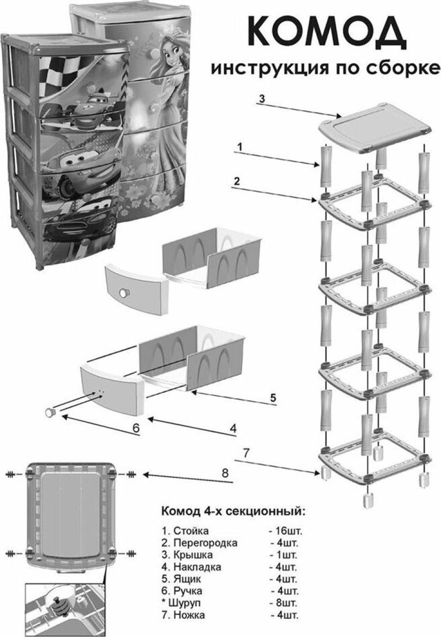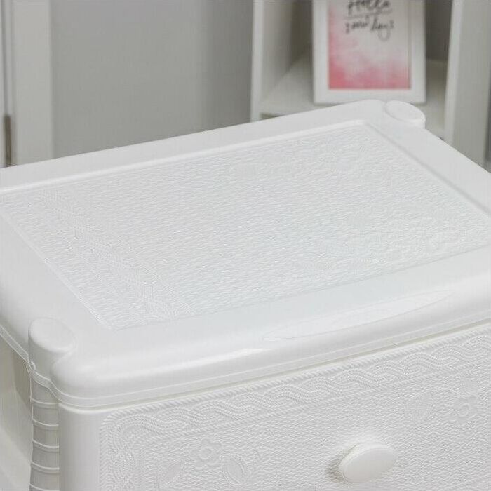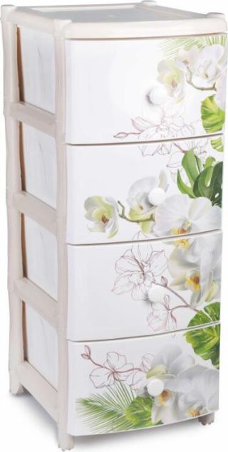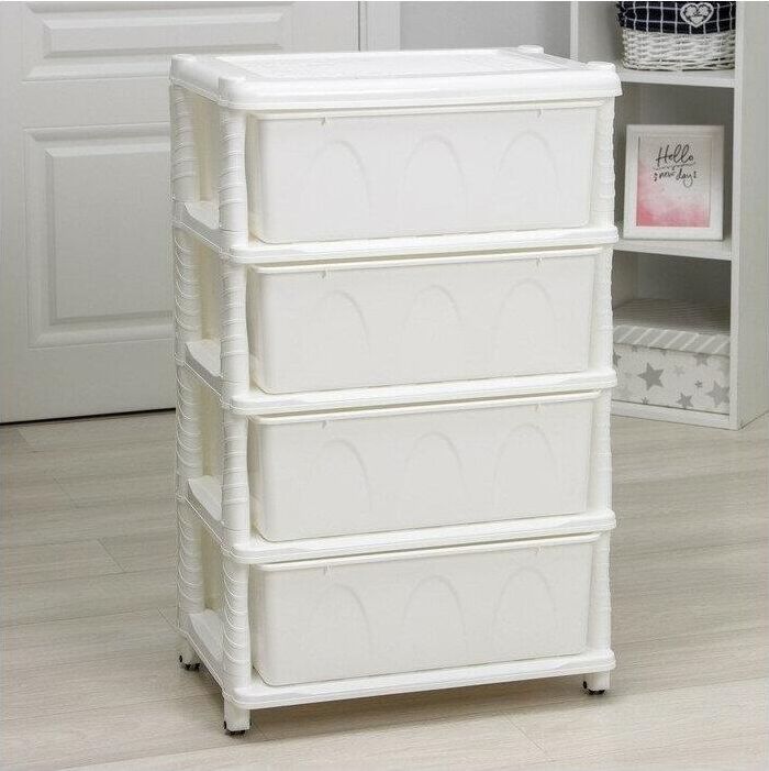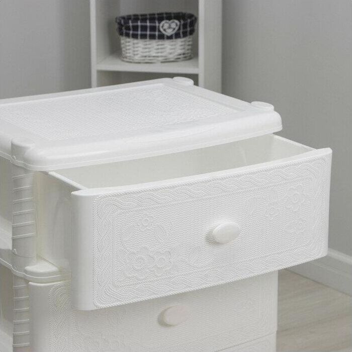 Вес 6.2 кг Размеры изделия (ДхШхВ) 425х560х905 мм Оригинальный и функциональный комод заслужено пользуется большой популярностью среди наших покупателей. Изделие способно гармонично вписаться в интерьер любой комнаты. Комод произведен из высококачественного и безопасного полипропилена. При производстве используется только сертифицированное и экологически чистое, качественное сырье отечественных и зарубежных производителей. Данное изделие произведено на современном технологичном оборудовании, а потому отличается прочностью и устойчивостью разнообразным механическим воздействиям. Также особую прочность изделию придает цельная конструкция перегородок. Оригинальный внешний вид задает плетеная конструкция на поверхности лицевой части ящика. Комод имеет четыре широких выдвижных ящика большой вместимости, в которых будет очень удобно хранить личные вещи и другие принадлежности. Благодаря небольшому весу, комод очень легко передвигается. Комод упаковывается в индивидуальную упаковку, где каждый клиент сможет найти ин