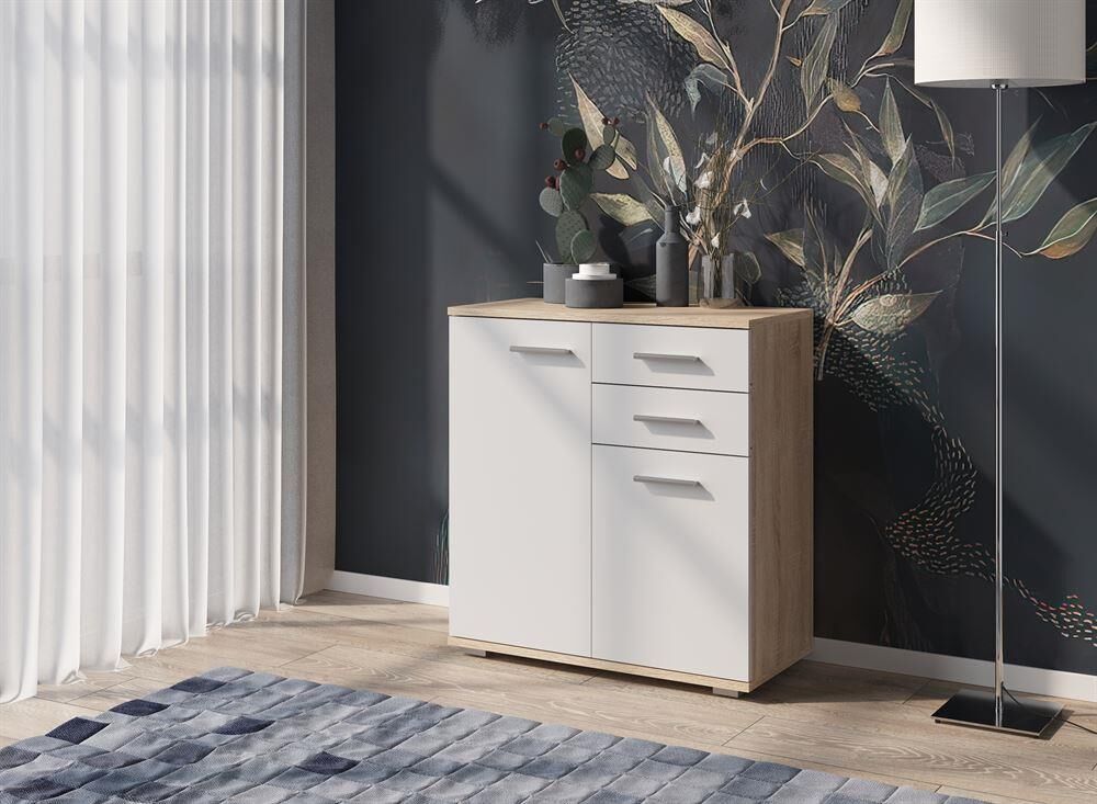 Комод с пятью полками и двумя выдвижными ящиками с роликовыми направляющими . Корпус и фасад изготовлены из ЛДСП 16 мм. Два цвета на выбор - Белый, Дуб Сонома/Белый. Функционально - компактные габариты изделия займет минимум пространства и поможет организовать универсальную систему хранения. Эстетично - универсальное современное цветовое решение. Практично - вместительный комод с удобной конструкцией гармонично впишется в любой интерьер.Размер изделия (ШхВхГ) 69 х 74 х 34 см.