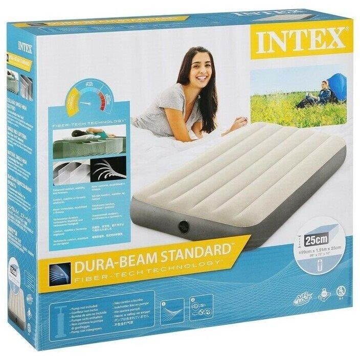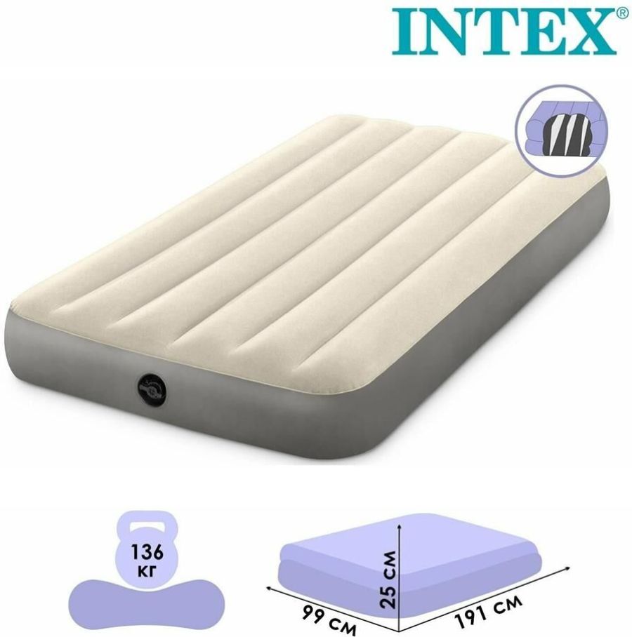 Надувной матрас — незаменимое приобретение для любителей больших компаний или отдыха на природе. Благодаря новейшей технологии Fiber-Tech разрыв внутренних перегородок практически исключен. Бархатистая поверхность матраса не даёт соскальзывать белью, и в то же время легко чистится. Также предусмотрен разъем для механических и электрических насосов Intex. Размер: 99x191x25 см. В комплекте: матрас, рем.комплект.