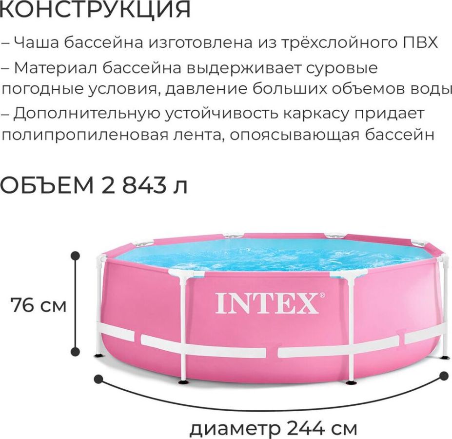 Каркасный бассейн — это простая конструкция, с которой семейный досуг на природе будет весёлым и приятным. Он порадует детей и взрослых в теплые солнечные деньки. Постоянная форма бассейна обеспечивается прочным металлическим каркасом, который может выдержать большие нагрузки. Размер: 244x76 см. Материал: Сталь, ПВХ, ПП, ПЭТ. В коробке.