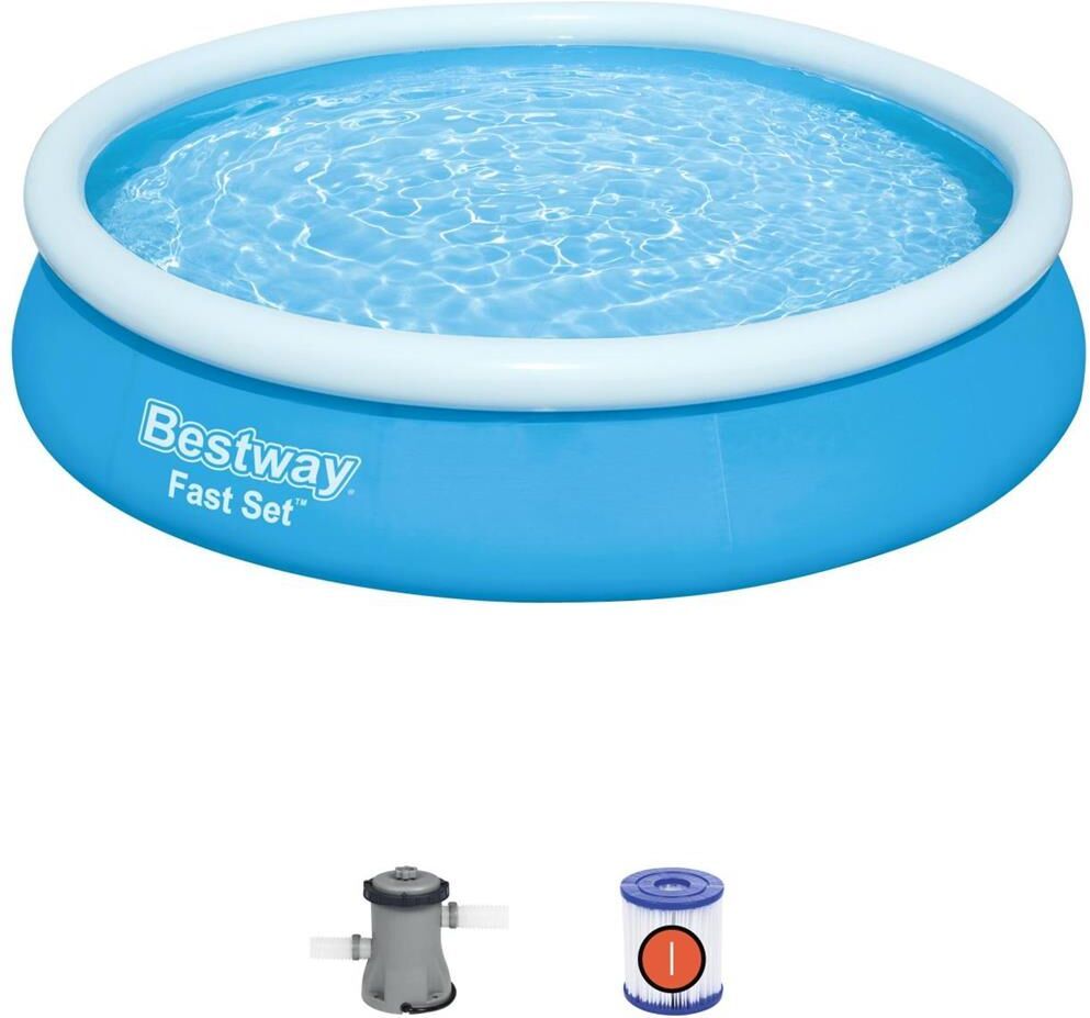 Надувной бассейн серии Fast SetTM. - трёхслойные стенки из прочного ПВХ и полиэстера. - стенки поддерживаются надувным кольцом. - выберите ровную поверхность, накачайте кольцо бассейна, и по мере наполнения водой, стенки бассейна будут подниматься. - сливной клапан с регулированием напора, для удобного слива воды. Клапан подключается к садовому шлангу, таким образом, вода может быть слита в стороне от места установки бассейна. - прочная заплатка для ремонта. Сверхпрочные стенки бассейна изготовлены из 3 различных слоёв материала. Внутрениий слой - сетка из полиэстера ламинирован внешними слоями из ПВХ увеличенной толщины. Размер: 366х76 см, вместимость по воде (80%): 5377 л. В комплект также входит фильтр-насос (1249 л/час).