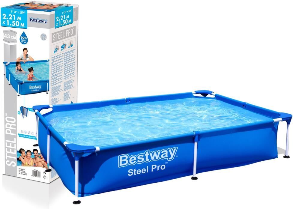 Каркасный бассейн 221 х 150 х 43 см, 1200 л, Steel Pro Bestway 56401 Каркасный бассейн Bestway 56401/56040 Splash Frame Pools отличается высокой прочностью и устойчивостью. Чаша выполнена из высококачественного трехслойного ПВХ: два слоя плотного винила и один - полиэстер для особой прочности. Каркас металлический нержавеющий оцинкованный. Не требует бетонирования и подготовки ямы, все, что нужно, это плоская, горизонтальная площадка. Сезонный бассейн (рекомендуется разбирать на холодное время года) обладает простой конструкцией - может быть легко разобран и собран заново. Время сборки и подключения бассейна не более 2-3 часов. Удобный сливной клапан позволяет присоединить садовый шланг, что дает возможность слить воду в любое место. Характеристики Материал - ПВХ, металл Объем - 1200 л Размер - 221 х 150 х 43 см Вес: 10,8 кг Размер коробки: 24 х 22,5 х 109 см Комплектация Каркасный бассейн Руководство по эксплуатации Ремкомплект
