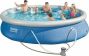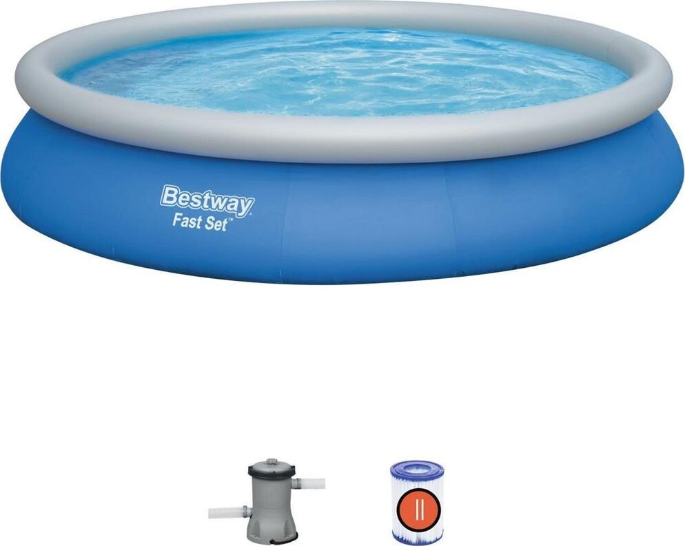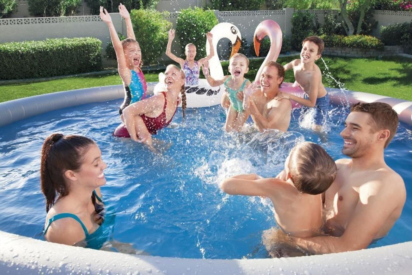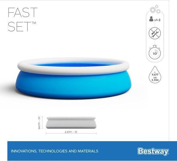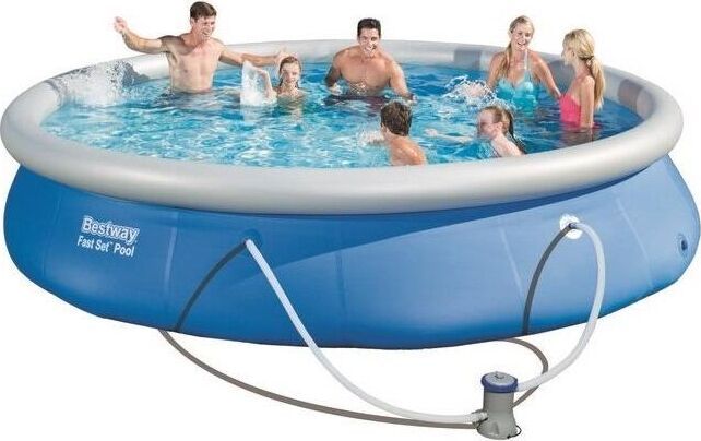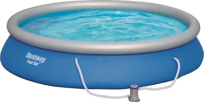 Бассейн с надувным бортом с ф.-насосом, 457х84 см, 9677 л, Bestway 57313 Надувной бассейн Bestway 57313 отличается простотой и легкостью. Стенки бассейна, выполнены из армированного ПВХ, внешний слой - полиэстер для особой прочности. Поддержка бортов осуществляется при помощи надувного кольца, которое поднимается по мере наполнения бассейна и расправляет его стенки. Для установки бассейна нужна плоская, горизонтальная площадка. Время сборки и подключения бассейна не более 10-15 минут. На холодное время года не рекомендуем оставлять бассейн на открытом воздухе. Удобный сливной клапан позволяет присоединить садовый шланг, что дает возможность слить воду в любое место. Характеристики Объем: 9677 л Размер: 457х84 см Фильтр-насос 2006 л/ч Комплектация Бассейн Фильтр-насос #58148 Заплатка для ремонта Инструкция Ф.-насос арт. 58383 (530gal), заплатка для ремонта