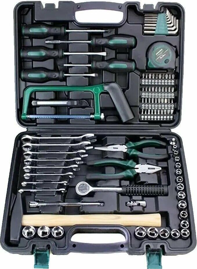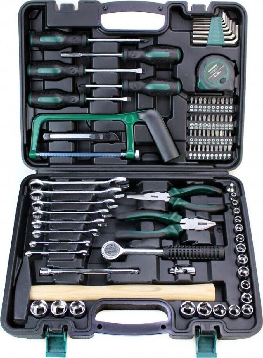 Набор инструмента FAV 90 SETS, 90 предметов: 2 отвертки (+5*75, -5*75), 2 отвертки (+5.8*100, -5.8*100), отвертка-битодержатель, ножовка по металлу, строительный нож, плоскогубцы (150 мм), тонкогубцы (150 мм), 8 шестигранных ключей: (1.5/2/2.5/3/4/5/5.5/6