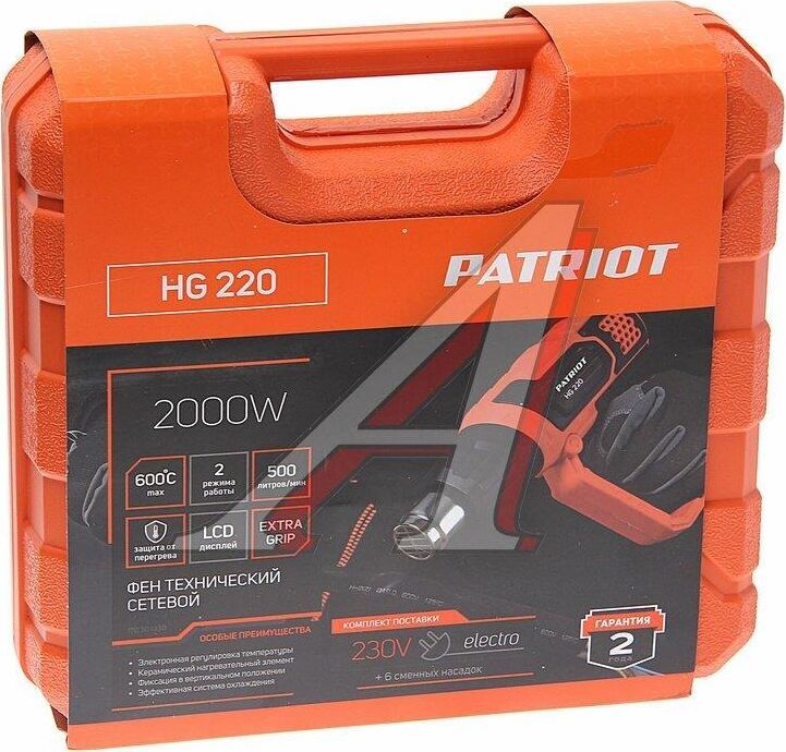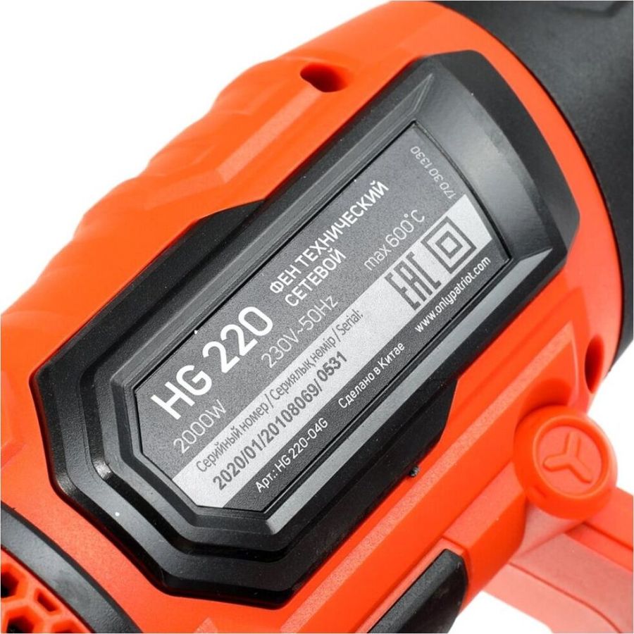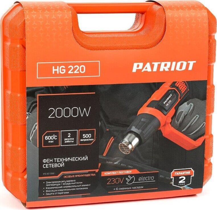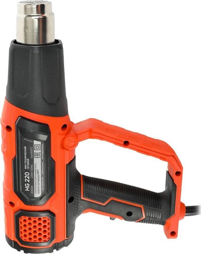 Количество режимов работы 3, Воздушный поток, л/мин 500/300/500, Диапазон температур, °С 25/25-350/25-600, Тип изоляции нагревательного элемента керамическая, Потребляемая мощность, Вт 2000, Прорезиненная рукоятка, Прорезиненный морозостойкий кабель, Цифровой дисплей диагностики, Фиксация в вертикальном положении.