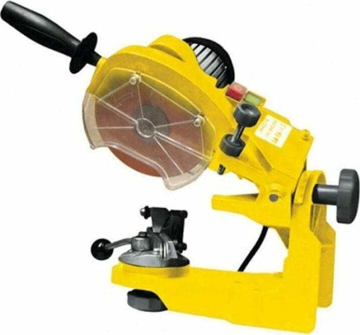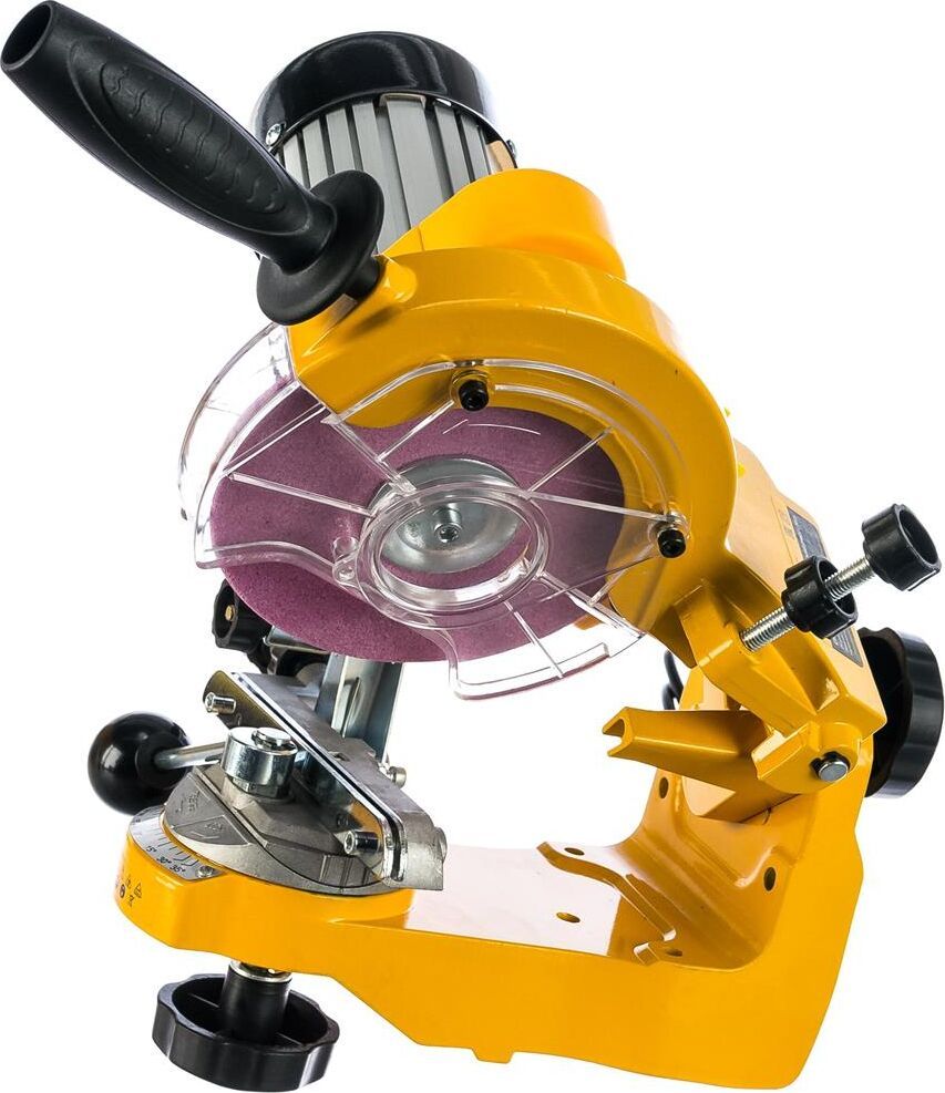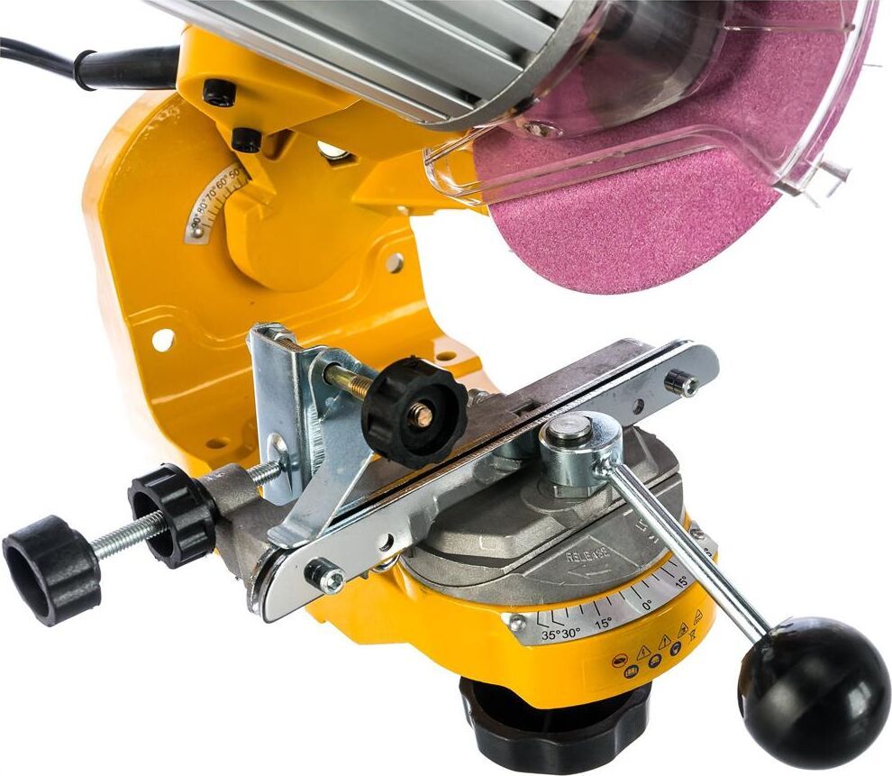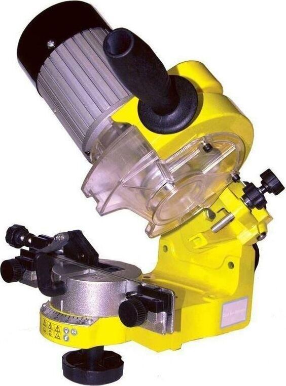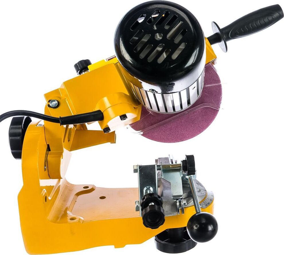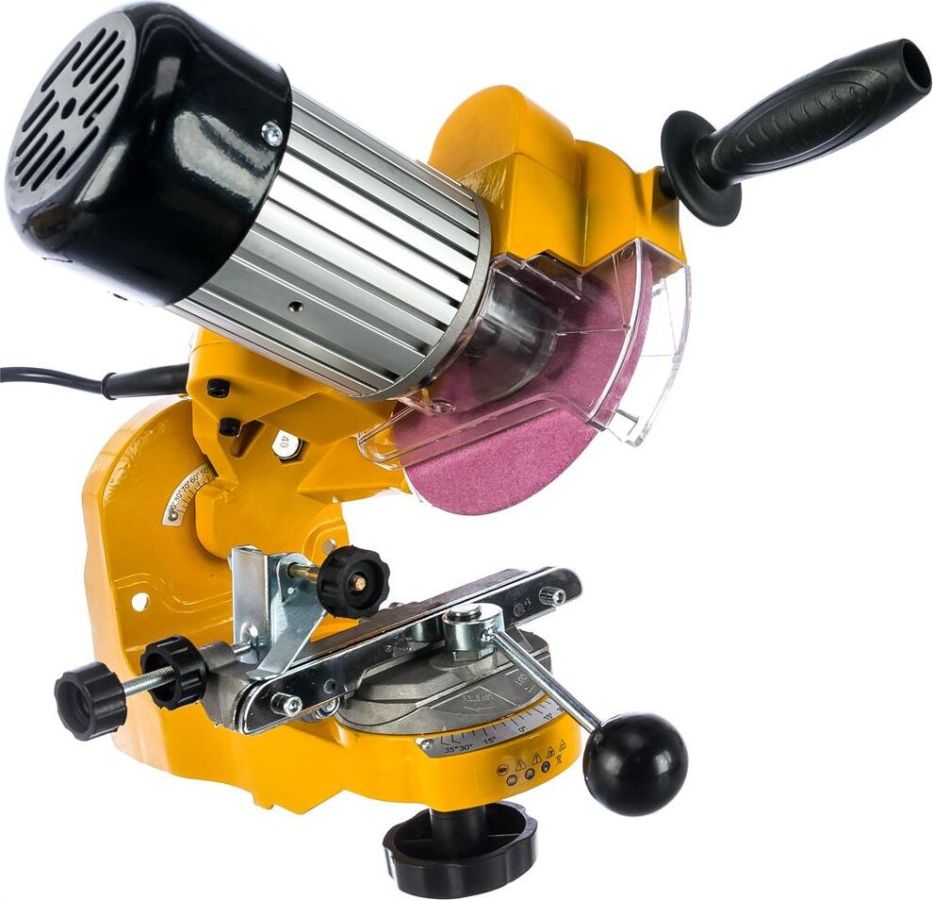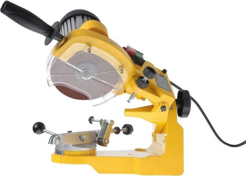 Для пильных цепей, мощность 230Вт, диск диаметром 145мм, скорость вращения 3000 об/мин, толщина диска 3,2мм, посадочный диаметр 22,5мм, угол наклона диска 0-40, расстояние между направляющими 1,1-2мм, угол поворота тисков относительно стола 0-35.