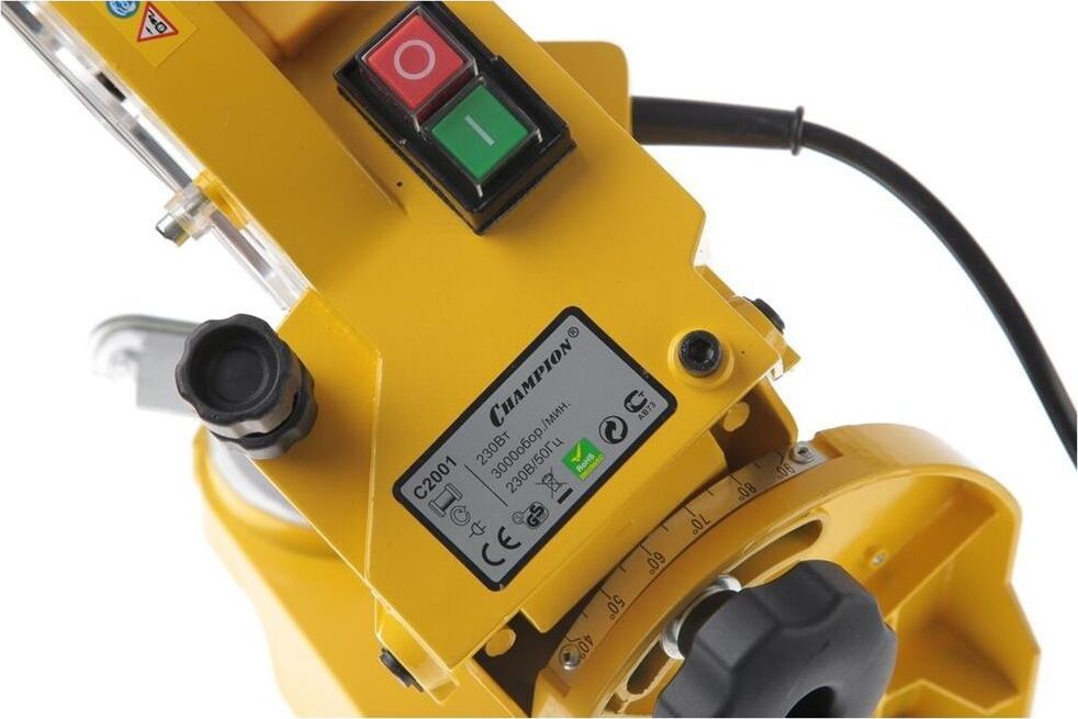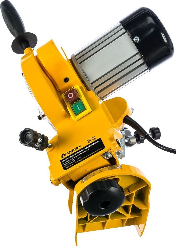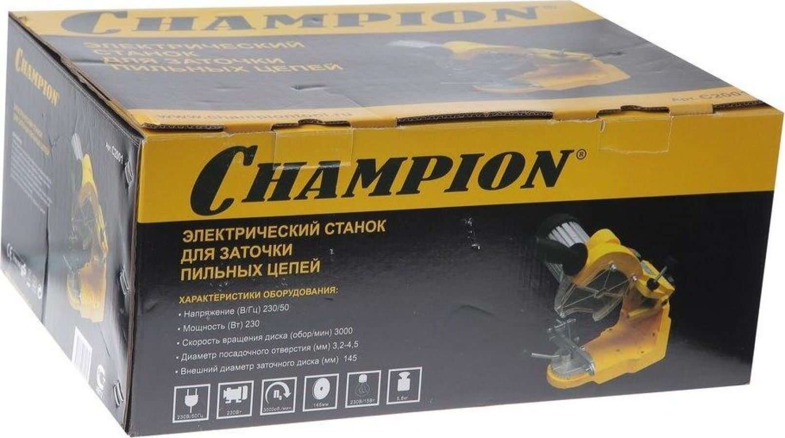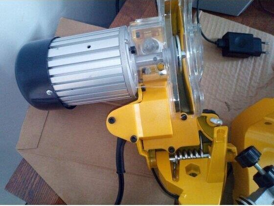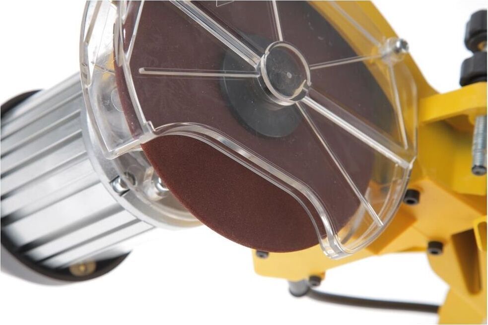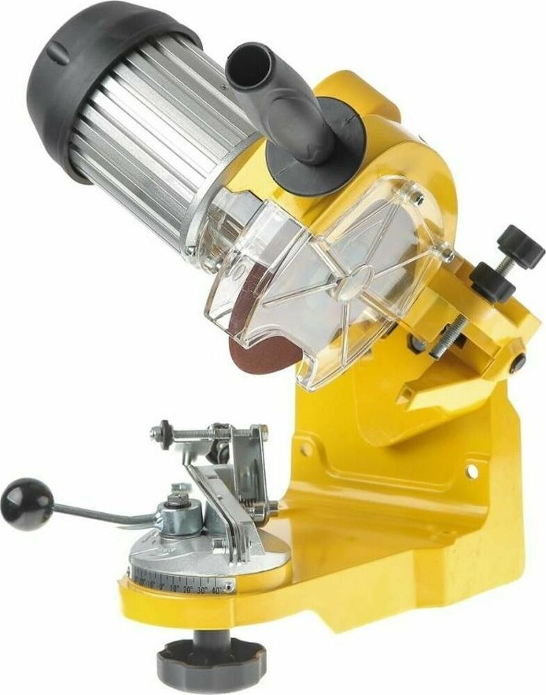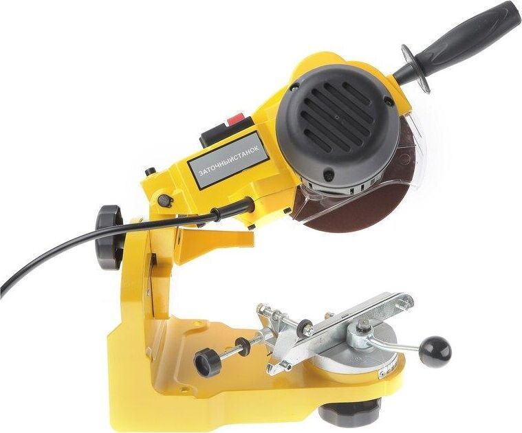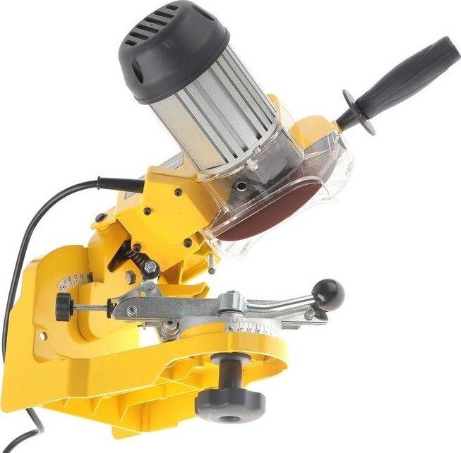Для пильных цепей, мощность 230Вт, диск диаметром 145мм, скорость вращения 3000 об/мин, толщина диска 3,2мм, посадочный диаметр 22,5мм, угол наклона диска 0-40, расстояние между направляющими 1,1-2мм, угол поворота тисков относительно стола 0-35.