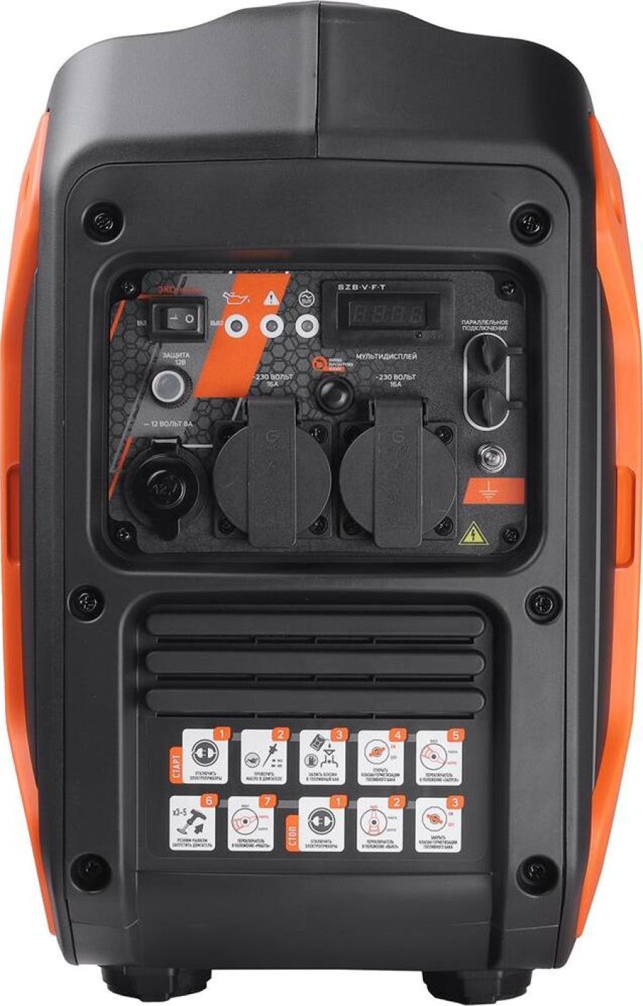 Макс. мощность 230В, кВт 2,8 Номинальная мощность 230В, кВт 2,5 Номинальный ток при 230В, А 11,4 Номинальный ток при 400В, А нет Макс. ток 12В, А 5 Розетки 12/230/400В, А 2х230В,16А / 1х12В Выход на 12B есть, прикуриватель Номинальное вырабатываемое напряжение, В 230 / 12 Частота, Гц 50 Исполнение корпуса шумозащитный Мощность, л.с. 4,6 Объем двигателя, см.куб 120 Объем топливного бака, л 5 Тип двигателя 4-х тактный бензиновый Объем масляного картера, л 0,4 Модель двигателя PATRIOT Тип топлива бензин АИ-92 Охлаждение воздушное Стартер ручной Свеча зажигания F7TC Количество цилиндров 1 Воздушный фильтр фильтр воздушный губчатый Защита от перегрузок есть Вольтметр есть Счетчик моточасов да Регулятор напряжения AVR Индикатор уровня топлива есть Датчик уровня масла есть Дисплей есть Обмотка альтернатора медь Тип альтернатора синхронный Класс защиты IP23