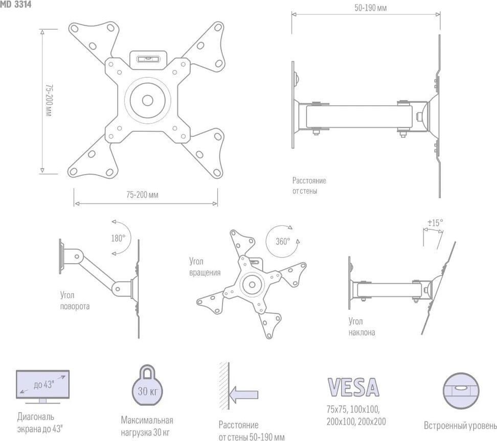 Тип кронштейна Наклонно-поворотный. Крепежные отверстия (VESA) 75x75 - 200x200. Мин. диагональ экрана (дюймы) 15. Макс. Диагональ экрана (дюймы) 43. Максимальная нагрузка, (кг.) 30. Угол наклона (°) +/-15. Угол повотора (°) 180. Вращение экрана (°) 360. Расстояние от стены (мм.) 50-360. Цвет кронштейна белый. Гарантия (лет) 2.