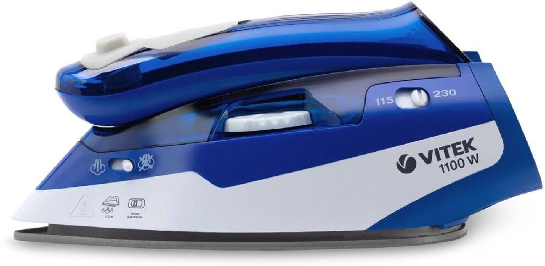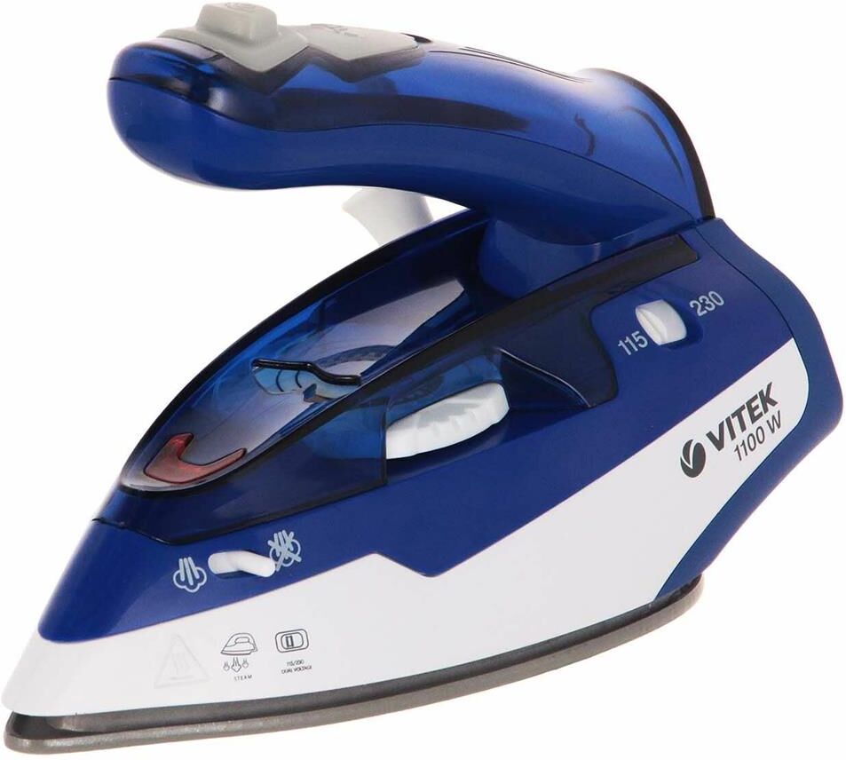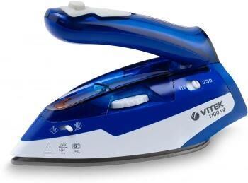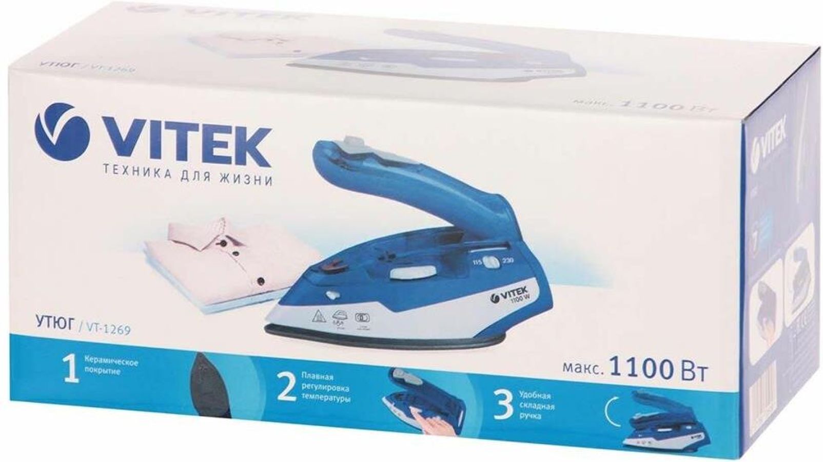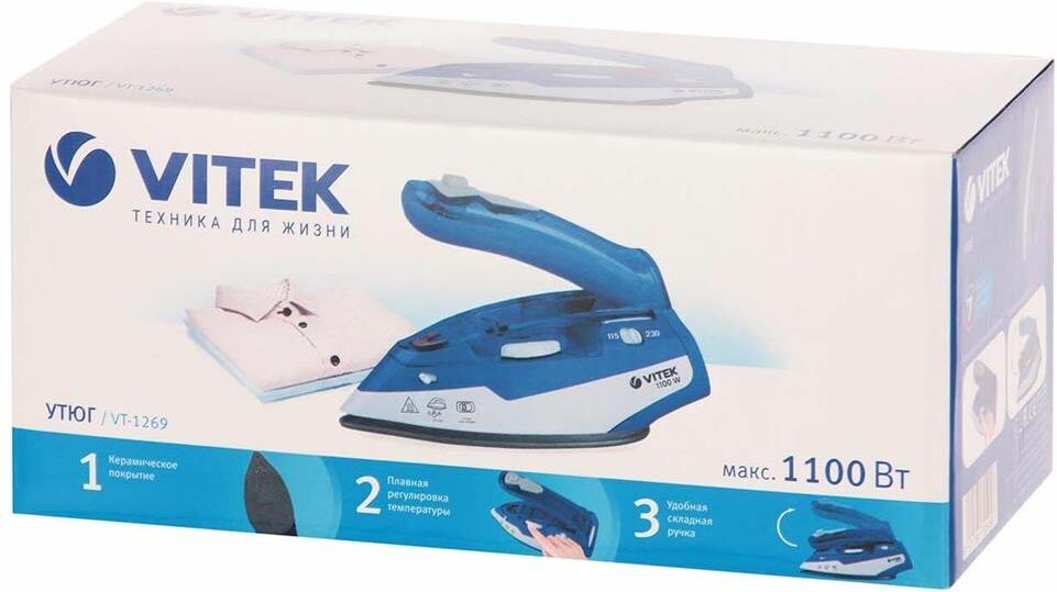 Утюг дорожный. Мощность: 1100 Вт, Емкость для воды: 60 мл, Подошва: Ceramic Ultra Care – уникальное керамическое покрытие для максимальной защиты ткани, Складная ручка. цвет: Синий/белый