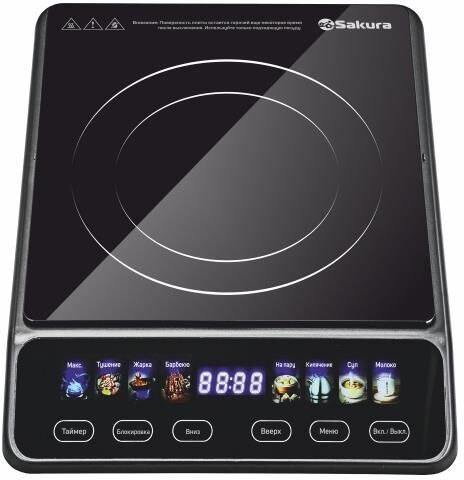 2000Вт, индукционный нагревательный элемент, LED-дисплей, сенсорное управление, варочная поверхность из закаленного полированного стекла Crystal Glass, индикатор работы, регулировка мощности, таймер на 3 часа, отсрочка старта. Режимы: тушение, жарка, барбекю, на пару, кипячение, суп, молоко. Варочная панель: 270*270мм. Подходит для посуды диаметром от 12 до 26 см. Макс.нагрузка: 8 кг. Цвет корпуса: черный.