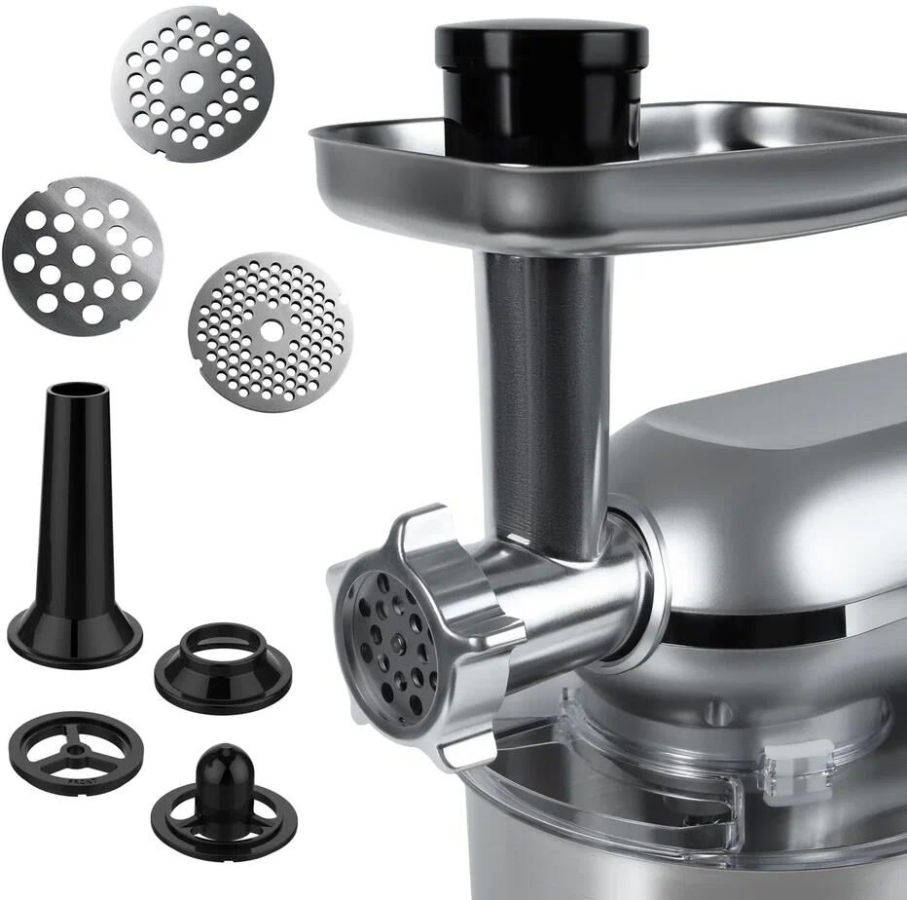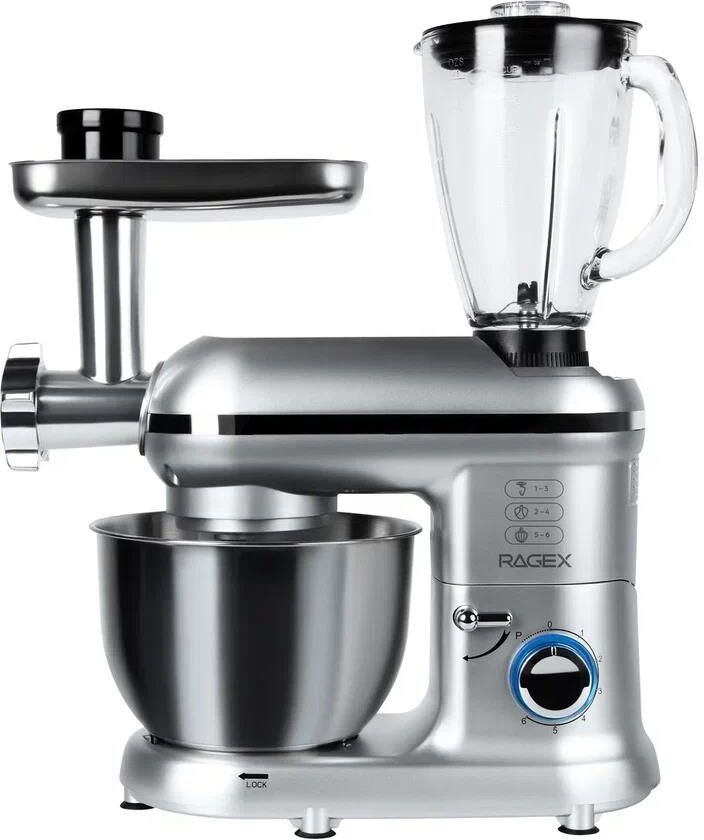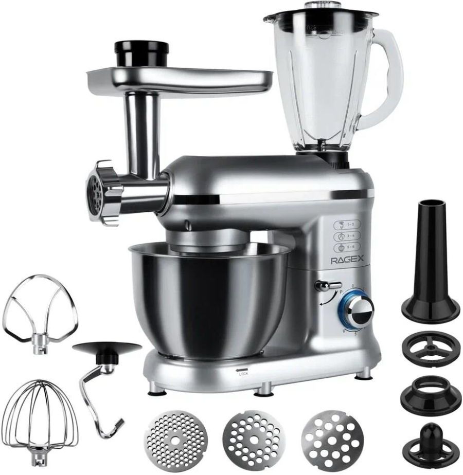 Многофункциональный кухонный комбайн R101-200 мощностью 1500 Вт с 6 скоростями и импульсным режимом (от 70 до 220 об/мин) станет незаменимым помощником на кухне. Прибор работает от сети 220-240 В (50-60 Гц) и оснащен 4.5-литровой чашей из нержавеющей стали и 1.5-литровым стеклянным блендером, сочетая функции мясорубки, блендера, планетарного миксера и овощерезки (докупается отдельно). Прочный АБС-пластиковый корпус в железно-сером цвете дополнен LED-индикатором работы и удобным рычагом для подъема рабочей головки. Особенности включают плавную регулировку скорости, импульсный режим, ножки-присоски для устойчивости и простую смену насадок. В комплекте: металлическая чаша, защитная крышка, крюк для теста, плоский битер, венчик для взбивания, блендер, мясорубка (с насадками для колбасок и кеббе), руководство пользователя. Устройство упаковано в подарочную и транспортировочную коробки, а уровень шума менее 75 дБ делает работу комфортной. Идеальный выбор для профессиональных кулинаров и домашних поваров.
