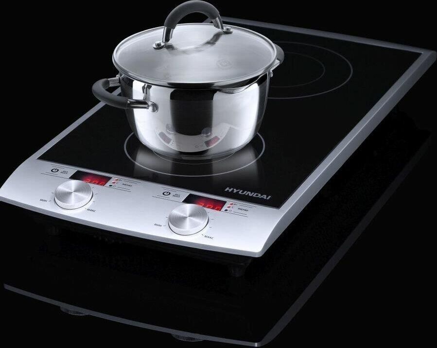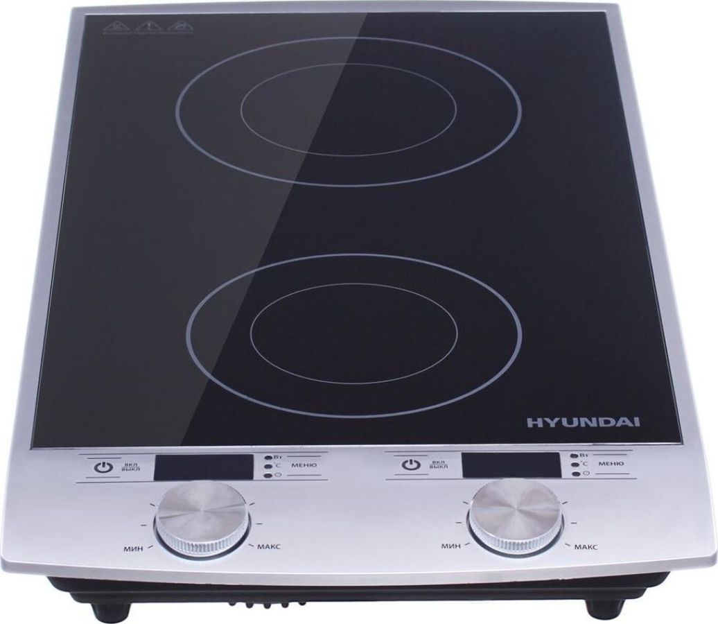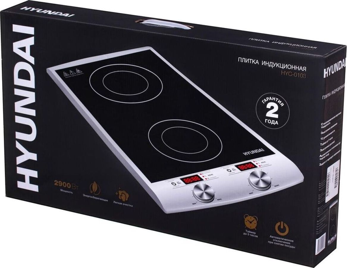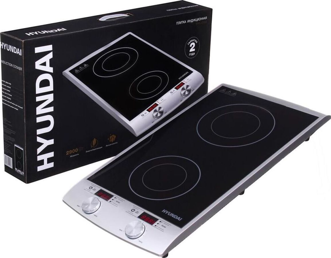 Двухкомфорочная индукционная плита; Мощность 2900 Вт; Два 4-рязрядных цифровых светодиодных дисплея; 10 уровней мощности; Таймер до 3 часов; Автоматическое отключение; Защита от перегрева; Сенсорный и механический тип управления; Цвет: серебряный/черный, размеры без упаковки 310x600x65 мм