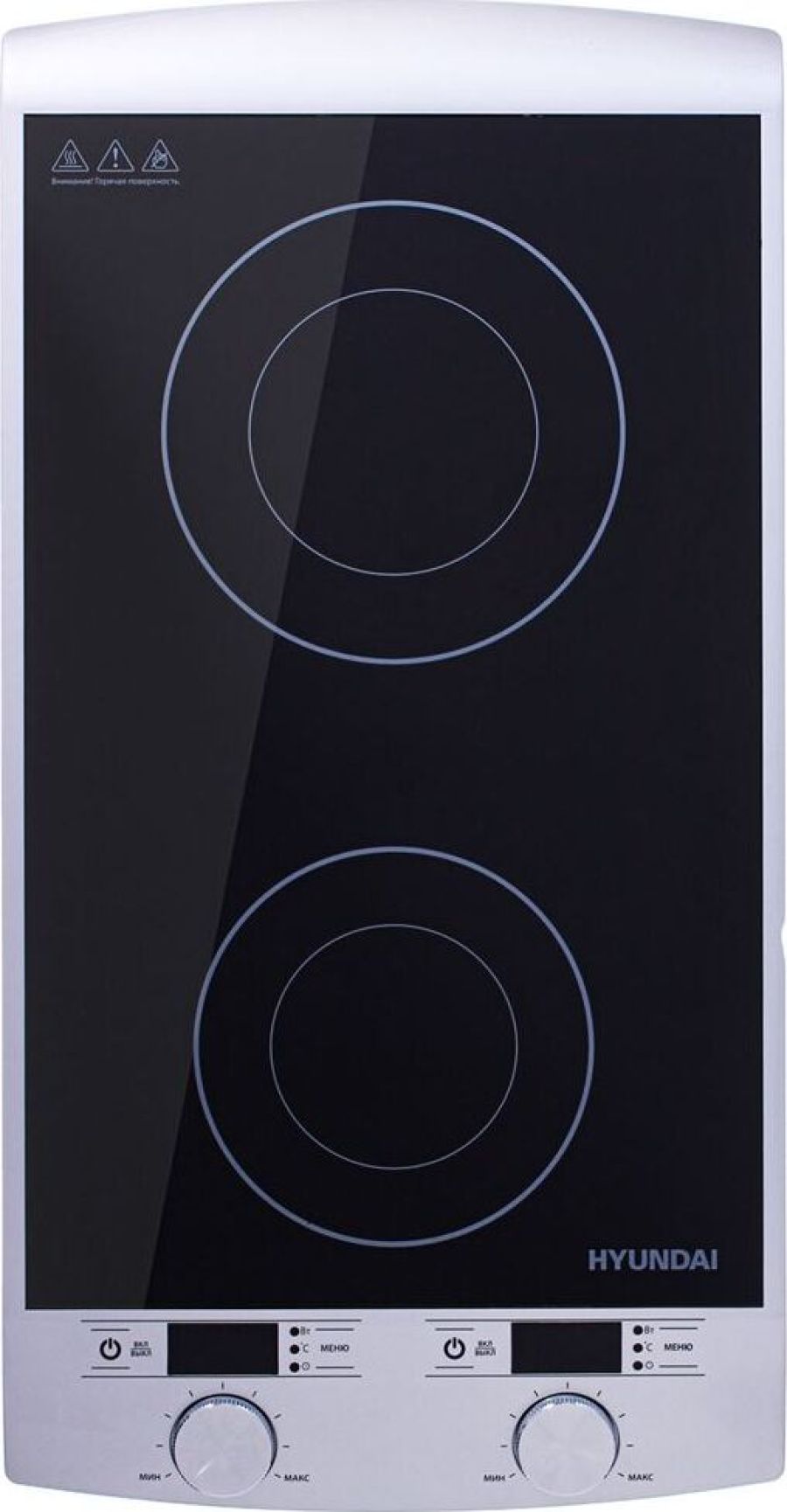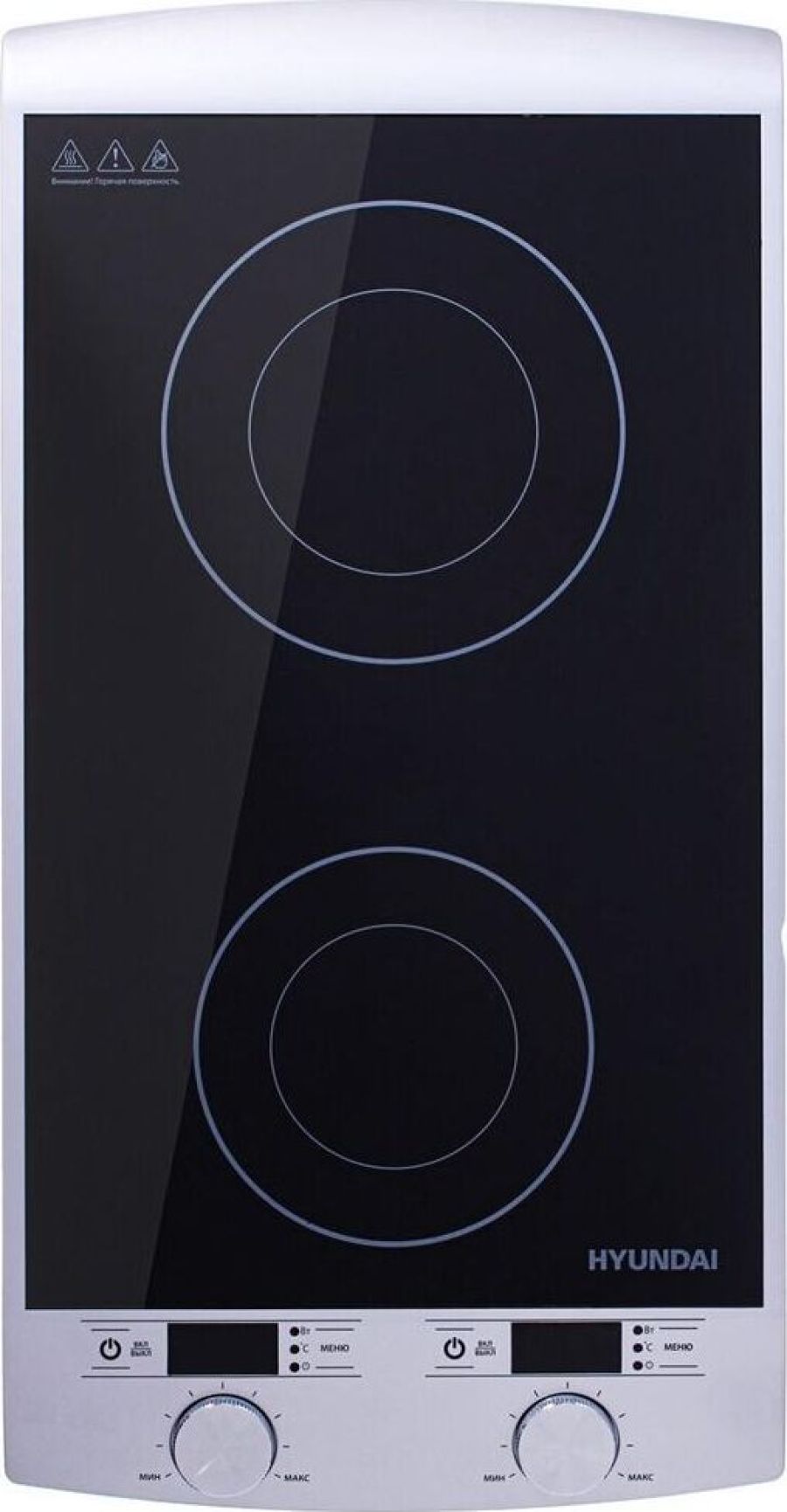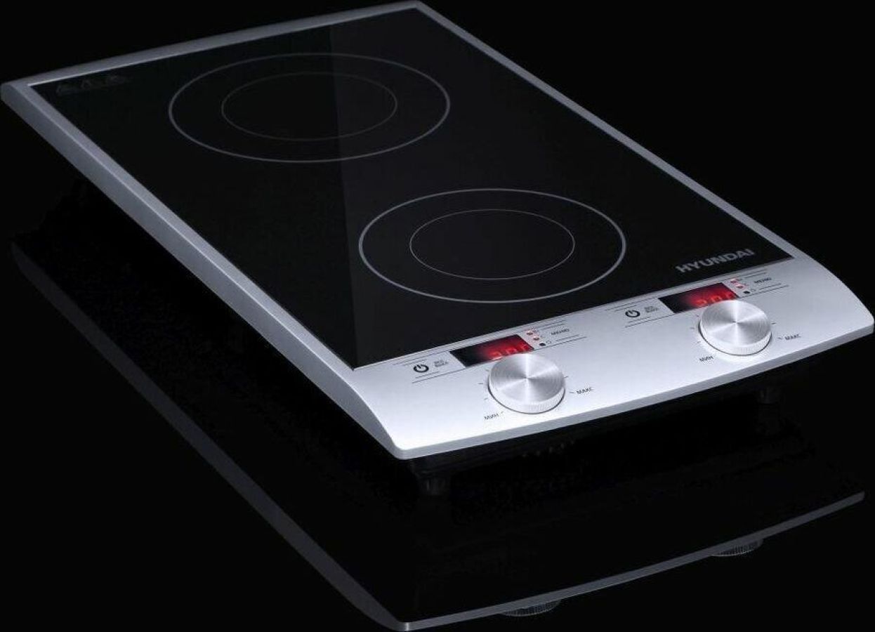Двухкомфорочная индукционная плита; Мощность 2900 Вт; Два 4-рязрядных цифровых светодиодных дисплея; 10 уровней мощности; Таймер до 3 часов; Автоматическое отключение; Защита от перегрева; Сенсорный и механический тип управления; Цвет: серебряный/черный, размеры без упаковки 310x600x65 мм