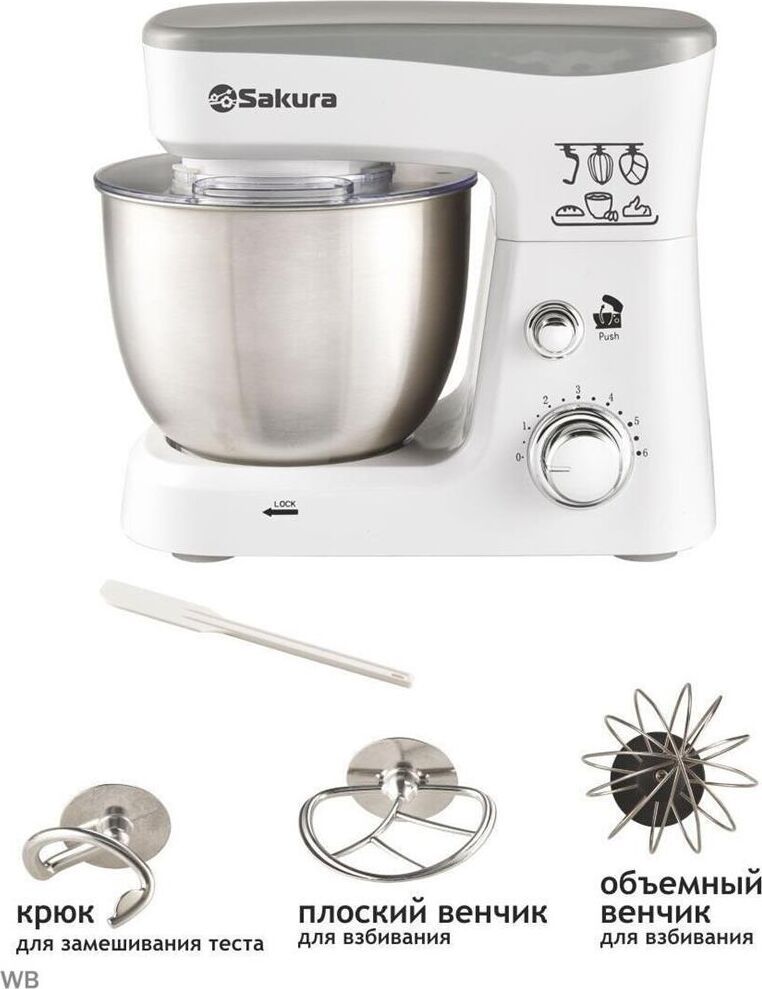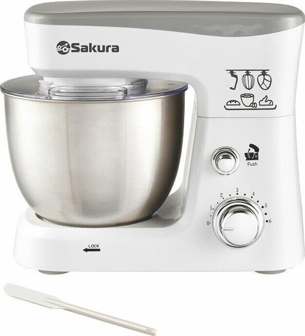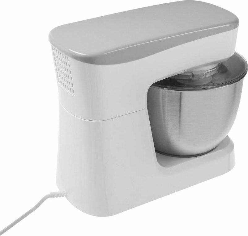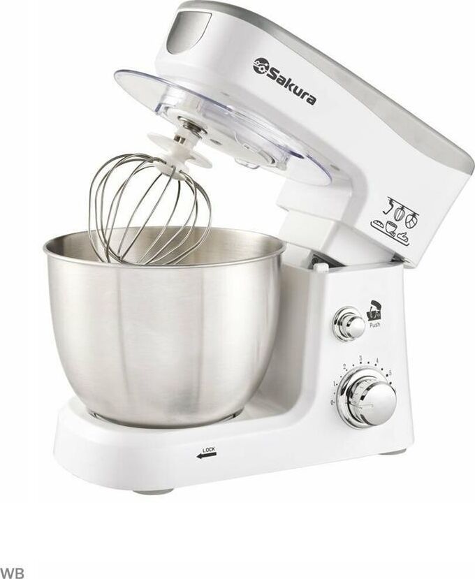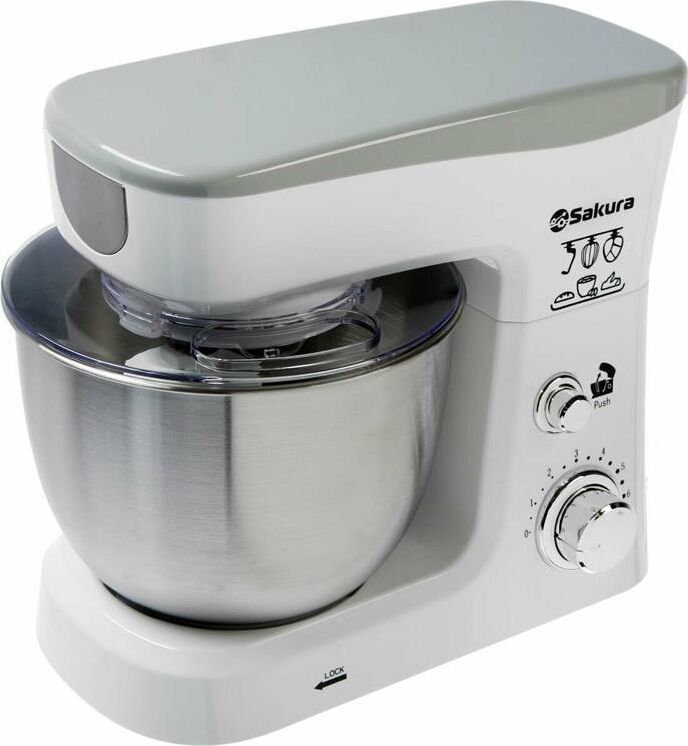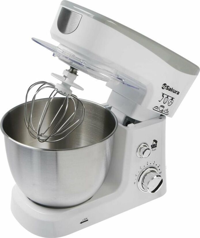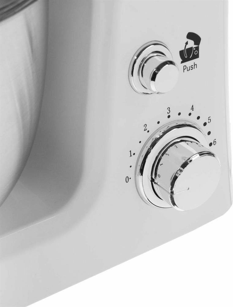 Миксер настольный с планетарным вращением насадок, максимальная мощность 1000 Вт, 6 скоростей работы, чаша из нержавеющей стали (3,5л) с прозрачной крышкой и отвертсием для добавления продуктов в процессе, 3 насадки (объемный венчик, плоский венчик и крюк), лопаточка в комплекте.