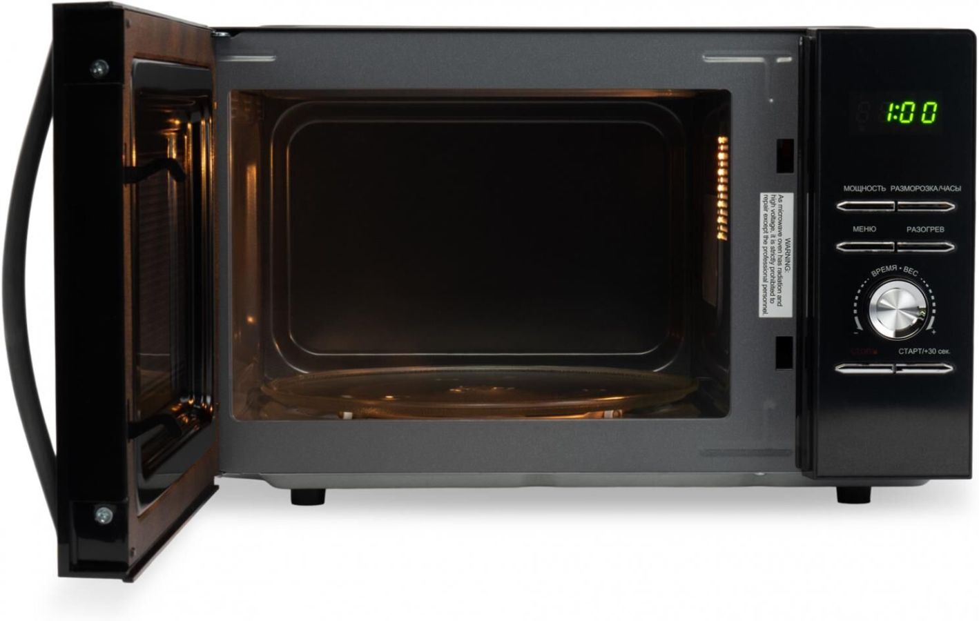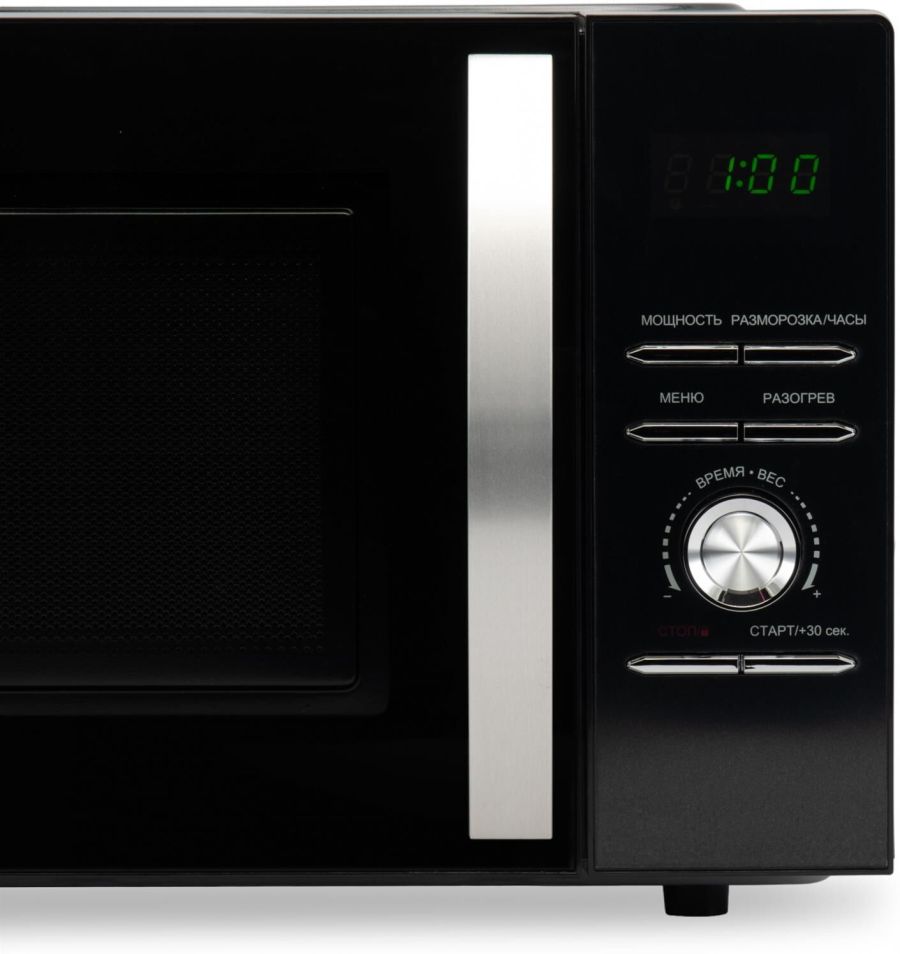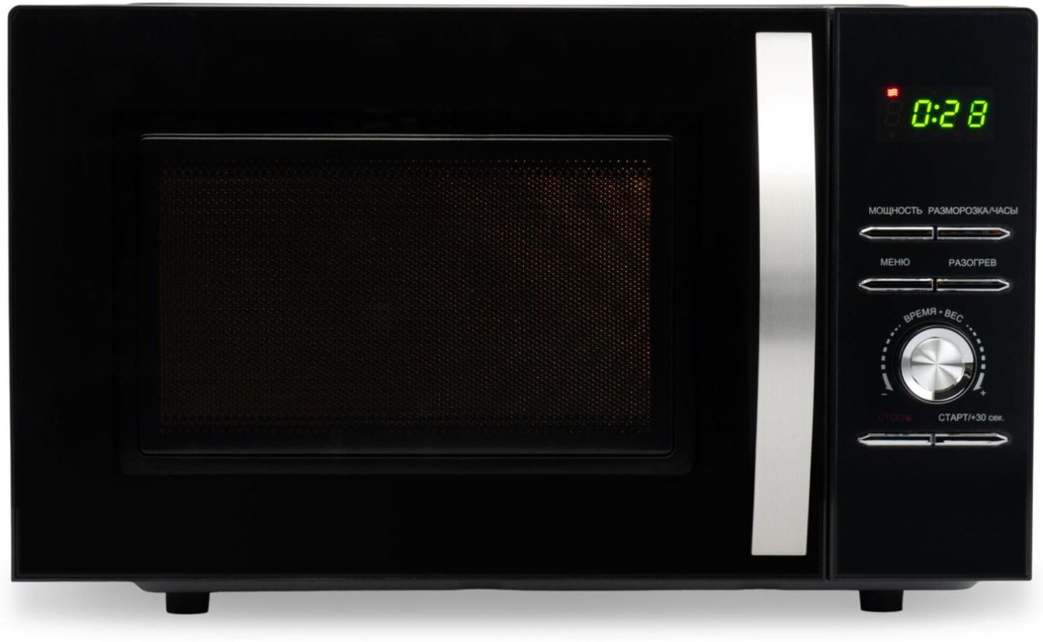 Объем 23 л; Мощность 800 Вт; Механизм открывания дверцы – ручка; Тип управления: электронное; Цвет: черный, Дисплей Диаметр поворотного стола 270 мм Блокировка от детей