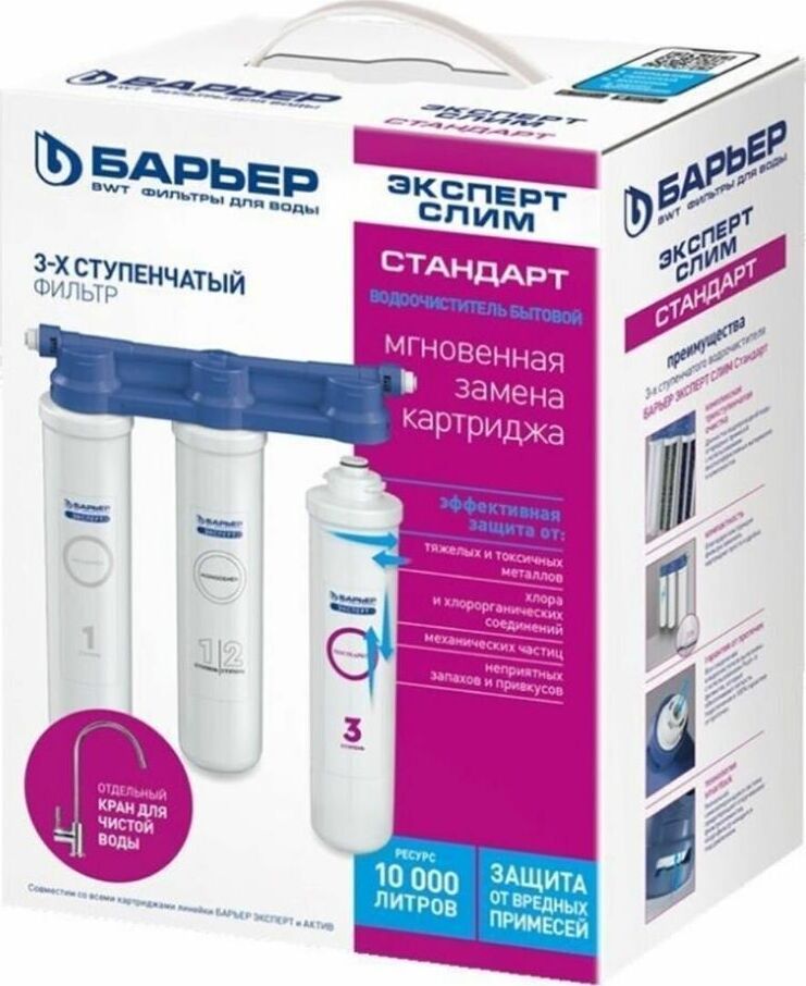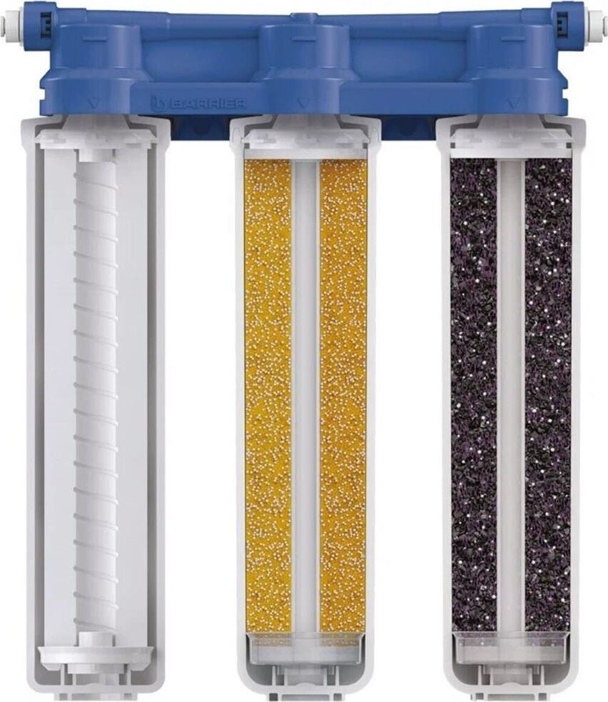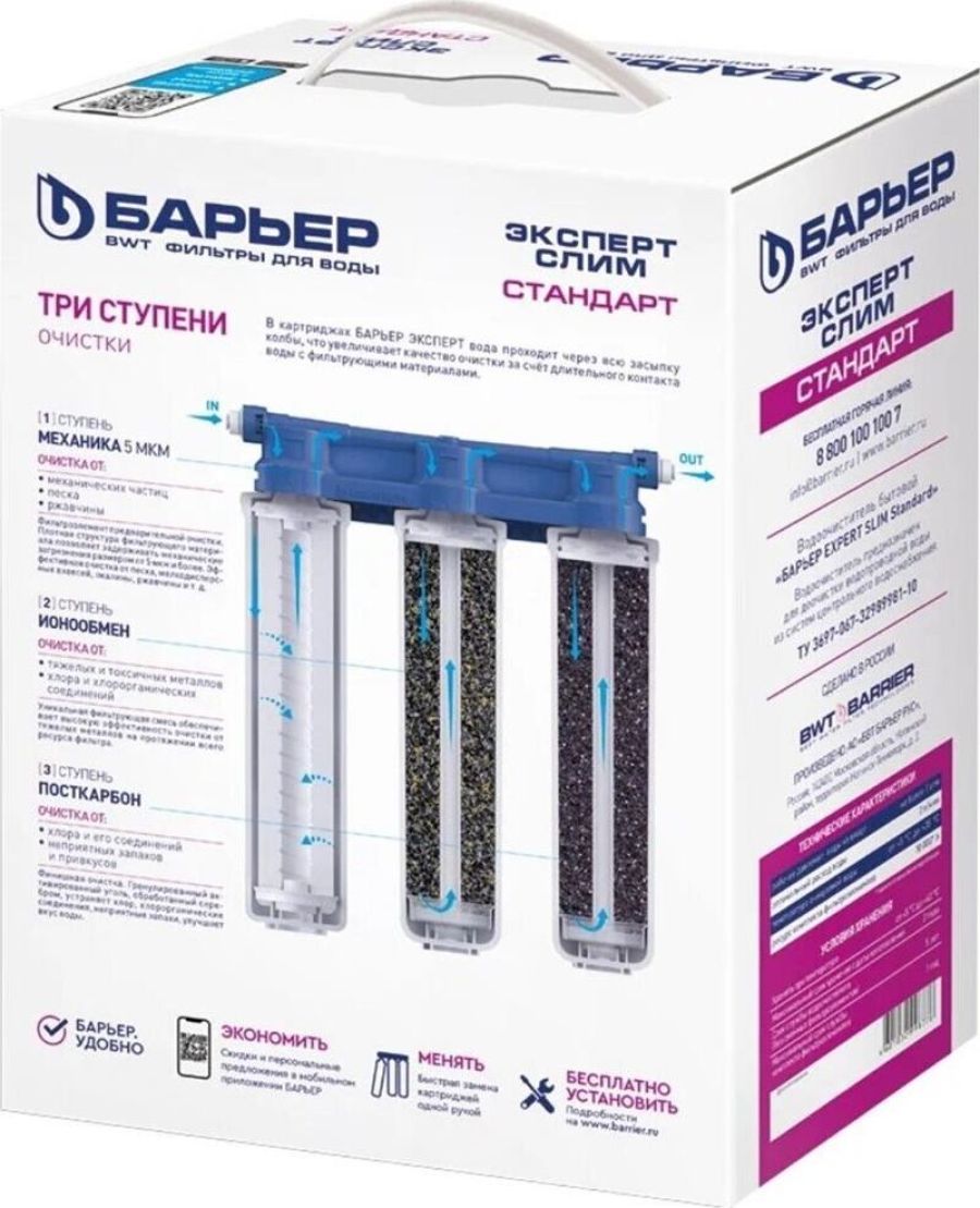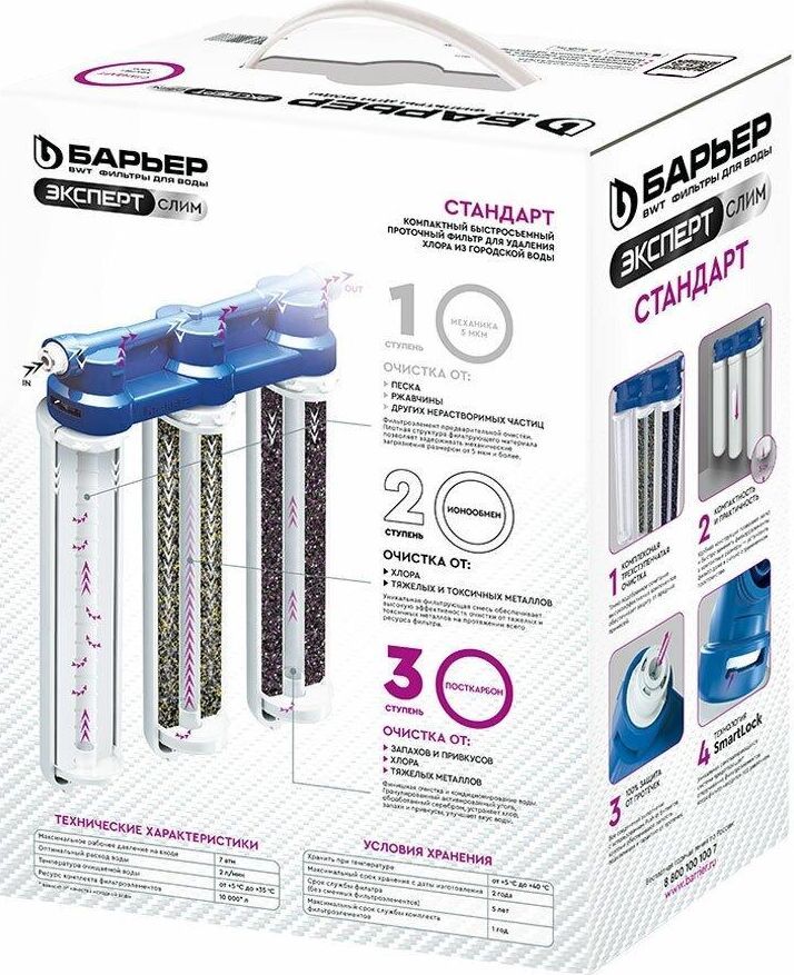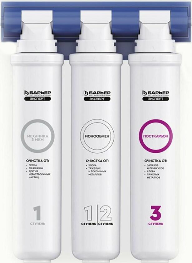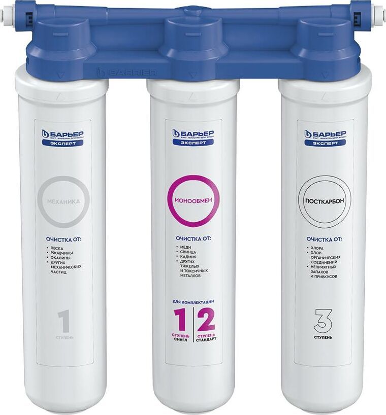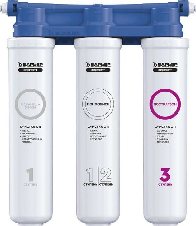 Изменённая версия нашей популярной модели БАРЬЕР ЭКСПЕРТ, Комплексная очистка водопроводной воды от всех основных содержащихся в ней вредных примесей. Картриджи всё так же можно менять одной рукой, теперь положение фильтрующих элементов статично. Вода проходит три этапа очистки: 1. "БАРЬЕР ЭКСПЕРТ Механика" удаляет любые механические примеси до 5 мкм (песок, пластик, ржавчину и т.д.). 2. "БАРЬЕР ЭКСПЕРТ ИоноОбмен" используется для эффективного удаления хлора, его соединений, а также тяжелых металлов (свинец, медь, кадмий и другие). 3. "БАРЬЕР ЭКСПЕРТ ПостКарбон" - финишная очистка и кондиционирование, устранение неприятных привкусов и остаточного хлора. Преимущества: - Технология SmartLock предотвращает протечки и срыв картриджа под давлением. - Технология OneTouch позволяет быстро поменять картридж без специальных знаний, инструментов или ключей. Система протестирована по стандарту NSF (США) на максимальное давление 30 АТМ. 4-х кратный запас прочности.