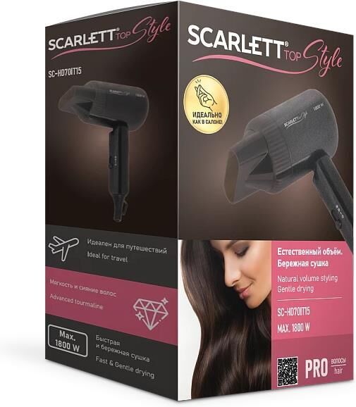 Мощность, Вт: 1800 Принадлежность к линейке: Top Style Количество скоростных режимов: 2 Тип мотора: DC Количество температурных режимов: 2 Возможность выбора холодного и горячего воздуха: Да Насадка - концентратор: Да Функция ионизации: Да Удобная петелька для подвешивания: Да Автоматическое отключение при перегреве: Да Длина электрошнура, м: 1.8 Особенности модели: Компактные размеры, складная ручка Цвет: Черный Стильный и компактный фен SC-HD70IT15 станет вашим идеальным попутчиком в любом путешествии. Прибор оснащен мощным мотором 1800 Вт и сменными температурными режимами, управлять которыми можно с помощью одной кнопки на рукоятке прибора. Мы позаботились о том, чтобы ваши волосы приобрели максимальный блеск и сияние, благодаря технологии Advanced Tourmaline. С помощью этой модели фена создание естественной укладки - доступно каждой в домашних условиях. Благодаря компактным размера и складной ручке фен удобно брать с собой.