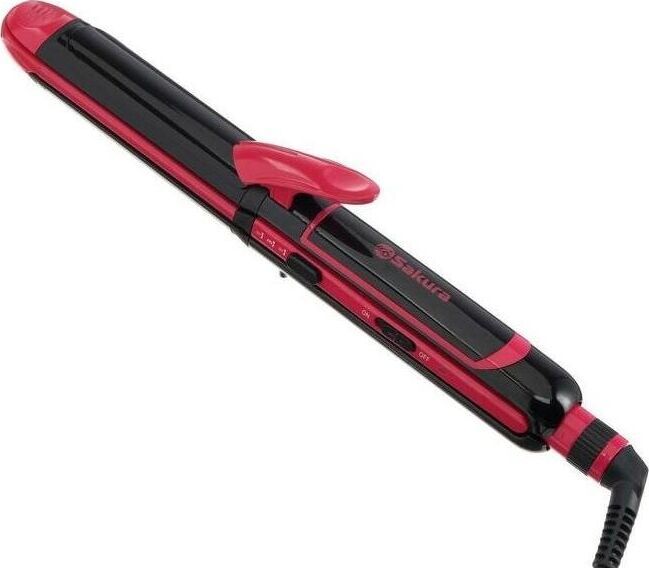 стайлер 3 в 1: выпрямитель, плойка и плойка-гофре; 45 Вт, керамическое покрытие, нагрев до 200°С, пластины 30х105 мм, диаметр плойки 30 мм, ненагревающийся наконечник, световой индикатор работы, термоизоляционная ручка с рычажком, шнур питания 1,9 м