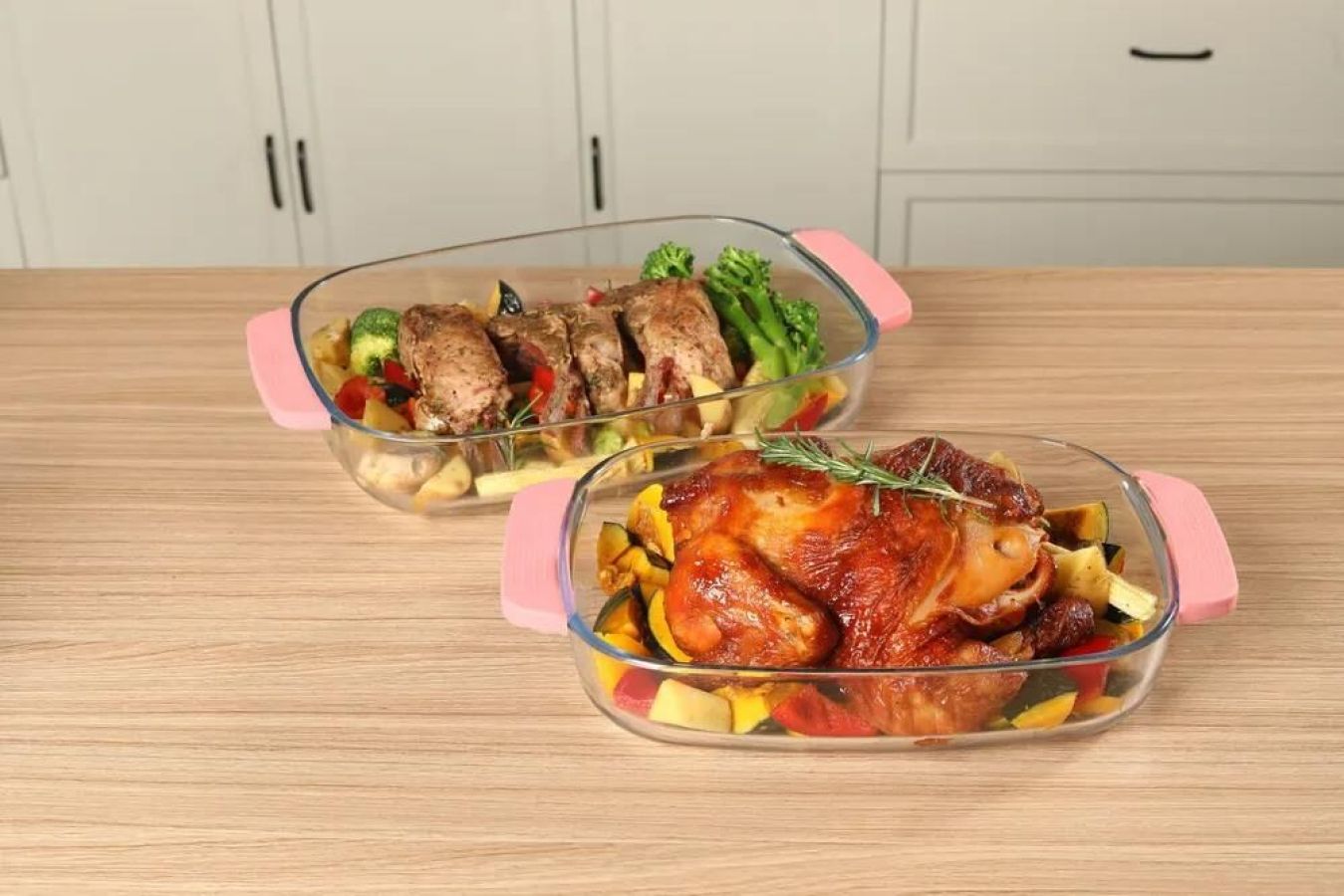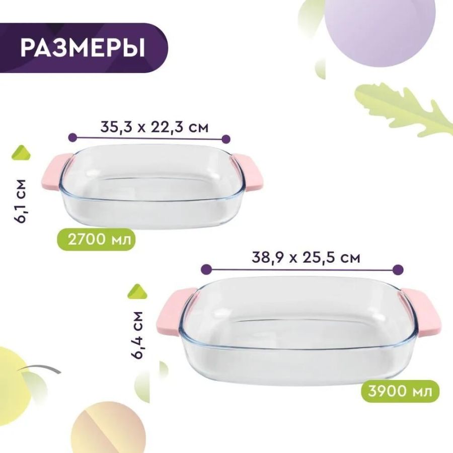 Набор форм для запекания из жаропрочного стекла 2700мл и 3900мл с силиконовыми ручками. Материал формы: Боросиликатное жаропрочное стекло. Материал ручек: Силикон. Цветная упаковка Объем: 2700 мл, размер: 353х223х61 мм Объем: 3900 мл, размер: 389х225х64 мм