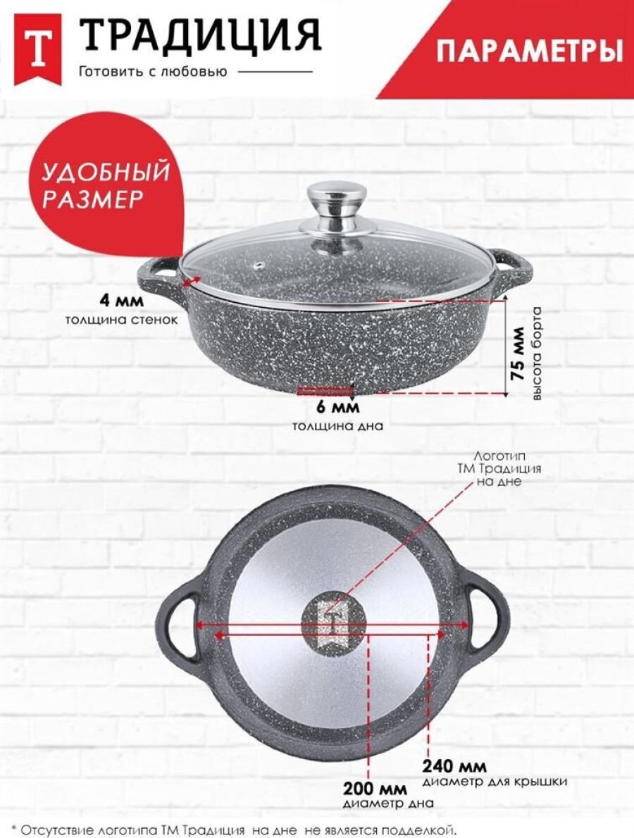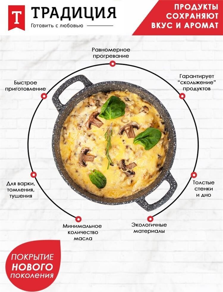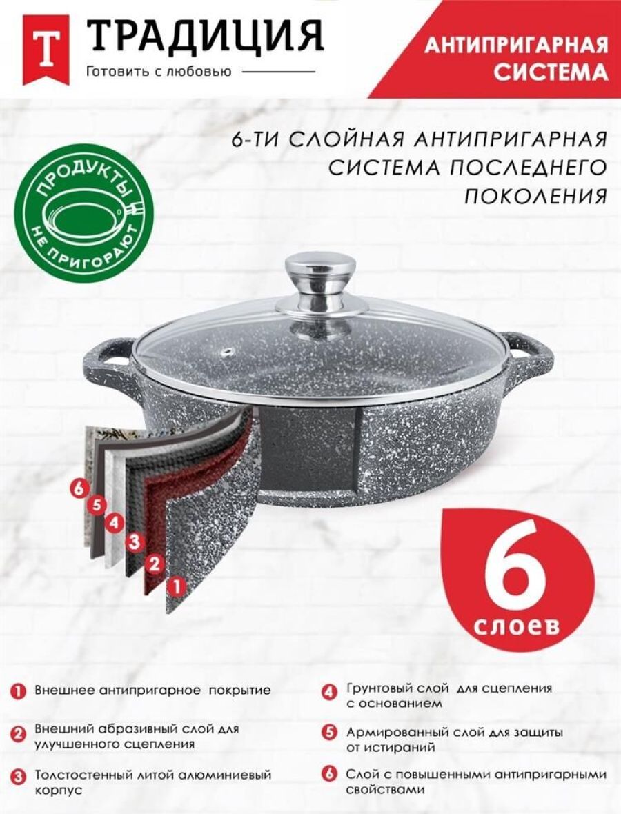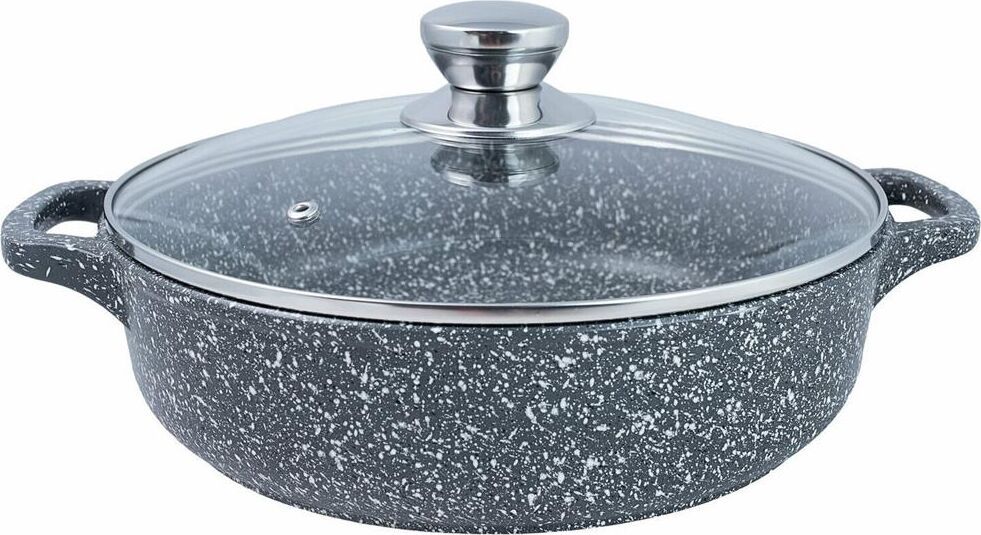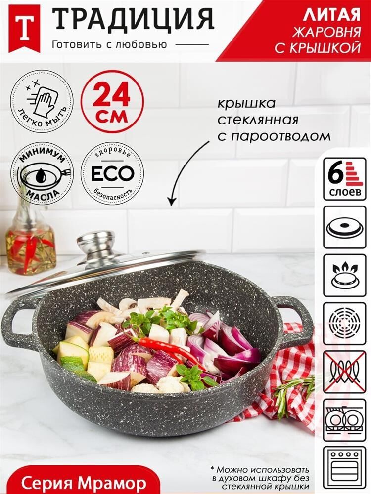 Серия- Мрамор Материал — литой алюминий, материал крышки - стеклок Объем- 2,2 л. Диаметр - 24 см. Покрытие - антипригарное покрытие Greblon NewTec C2+ Толщина дна - 6мм, толщина стенок - 4 мм