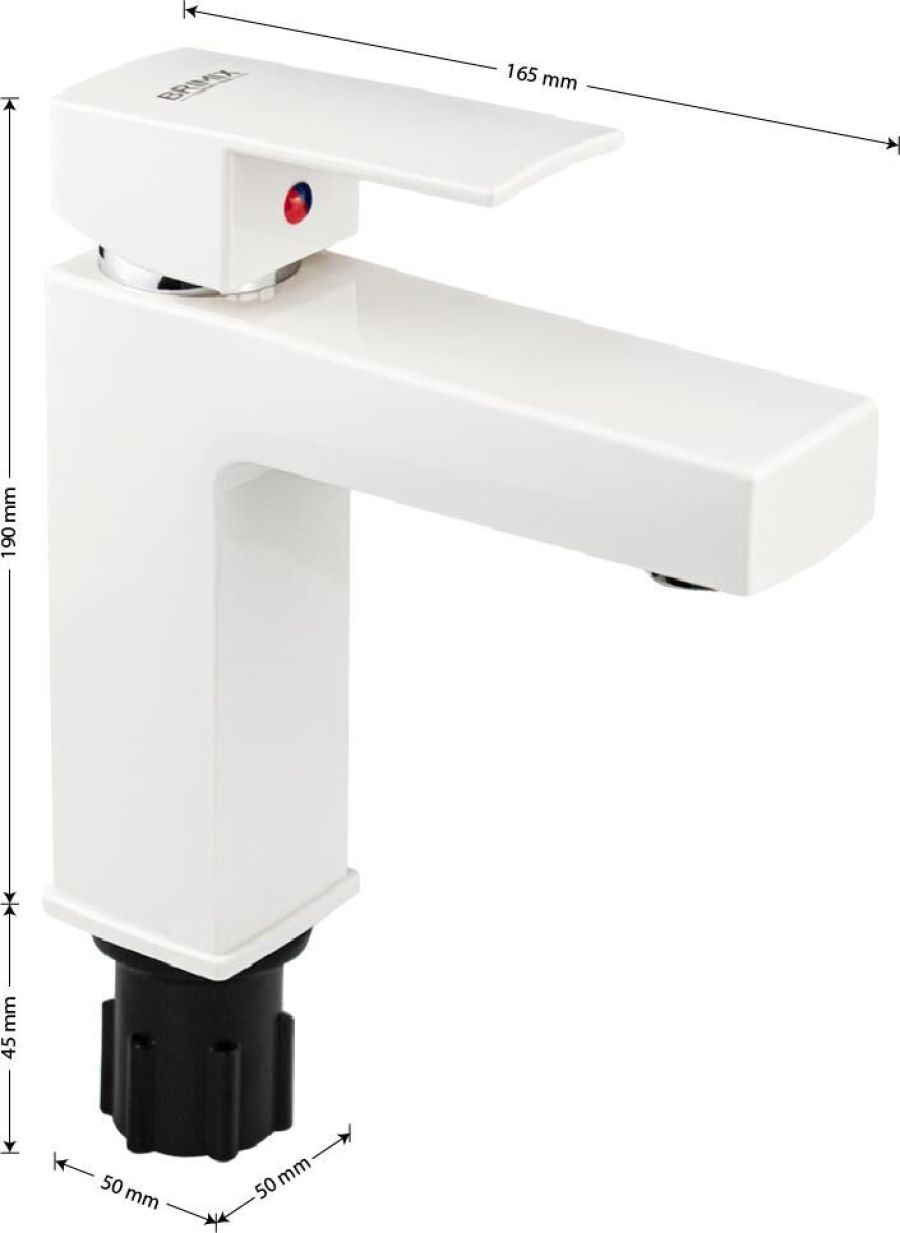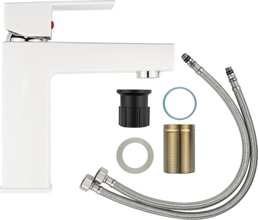 Смеситель для раковины, из высокопрочного пластика АБС, БЕЛЫЙ с коротким изливом, литой квадратный корпус, литая ручка, шаровый. Крепление резьба - гайка, картридж d = 40 мм. хромированный аэратор для экономии воды. Габаритные размеры: высота 190 мм, длина 165 мм, посадочное седло 50*50 мм, длина резьбы 45 мм, длина подводки 450 мм. Вес - 0.90 кг, объём - 0.00248 м3. В комплекте паспорт, корпус, пластиковая подводка с латунными штуцерами 1/2, крепеж, набор прокладок.