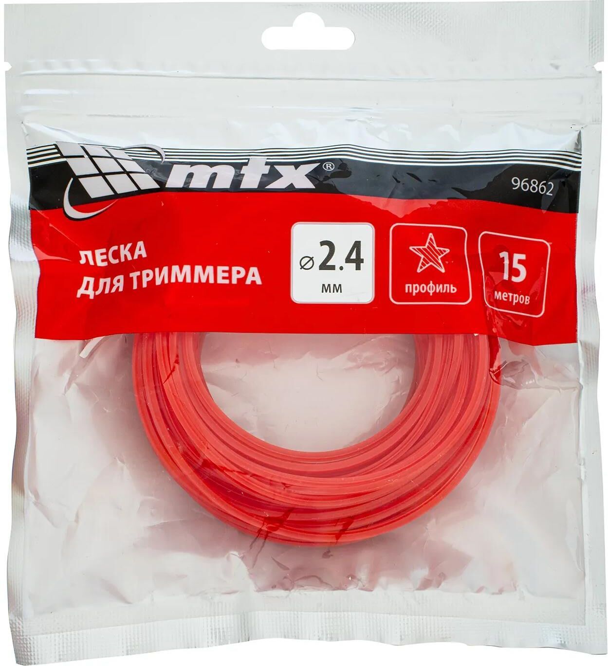 Леска для триммера MTX 96862 с сечением «звезда», толщиной 2,4 мм и длиной 15 м, подходит для скашивания как мягкой газонной, так и жесткой травы.