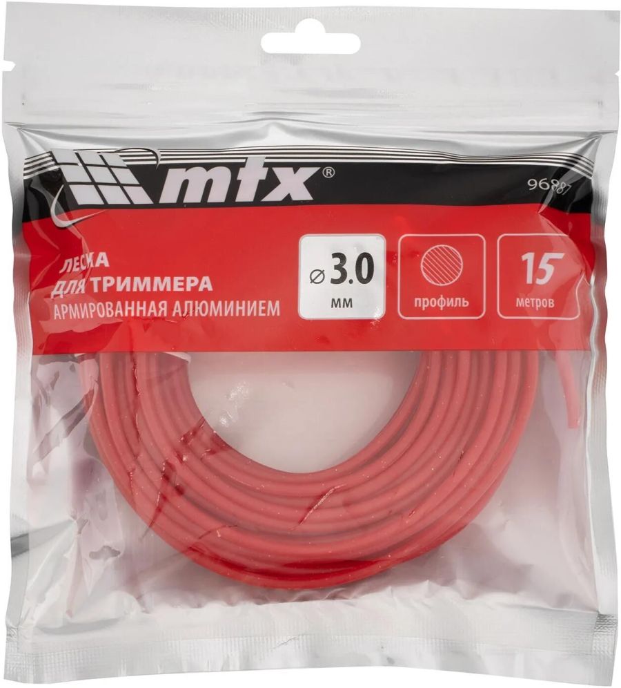 Леска для триммера MTX 96887 круглого сечения, диаметром 3,0 мм и длиной 15 м, армированная алюминием, эффективно срезает как газонную, так и высокую, жесткую или сухую траву.