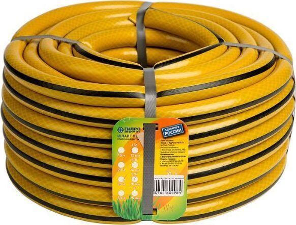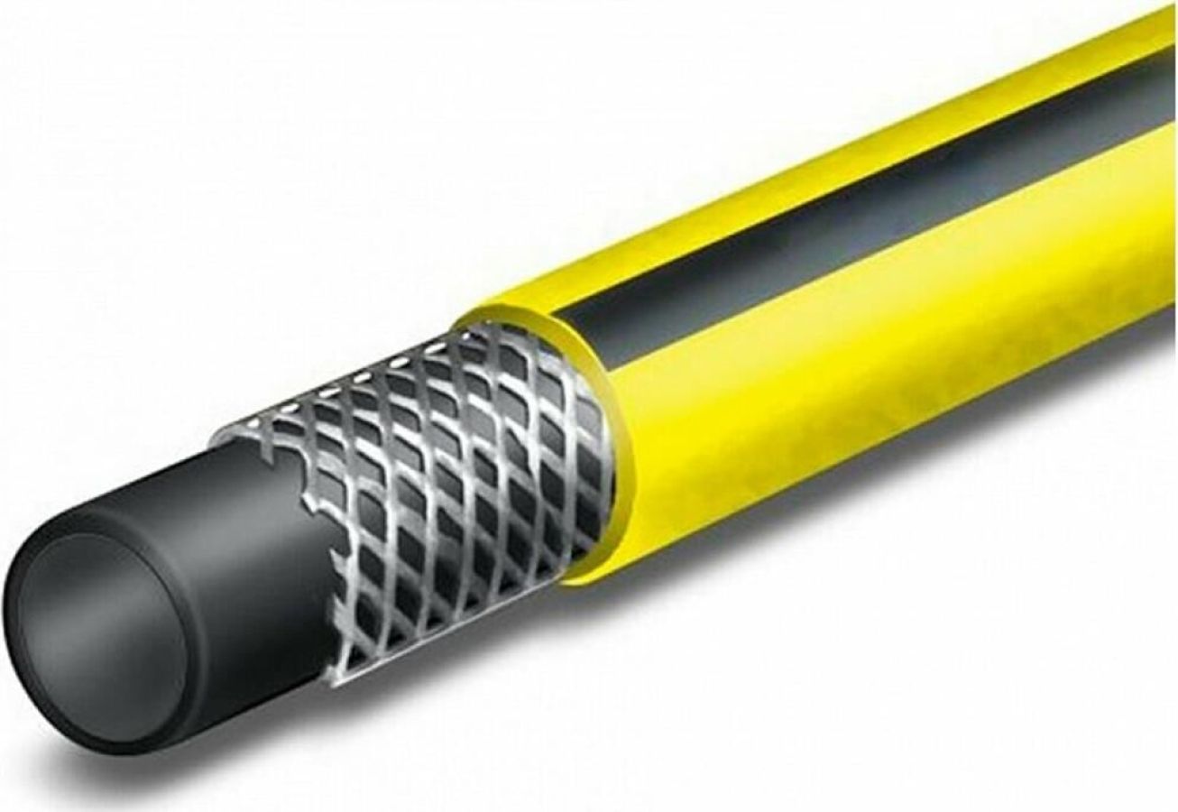 Диаметр 12 мм. Длина в бухте 25 м. Рабочий диапазон температур -10°С/+50°С. Максимальное рабочее давление 6 атмосфер. Высококачественный прочный трехслойный шланг ПВХ, усиленный нитью. Цвет: желтый с черной полосой и черным внутренним слоем. Состоит из 3-х слоев: внутренний слой, обеспечивающий экологическую безопасность усиливающая нить внешний слой защищающий от УФ-лучей, истирания и перекручивания. Предназначен для использования в быту: для полива огородов, садовых и дачных участков. Устойчив к воздействию солнечных лучей, не выцветает, не подвержен гниению Экологически чистый продукт, не содержит кадмий, барий, свинец. Производитель: Россия.