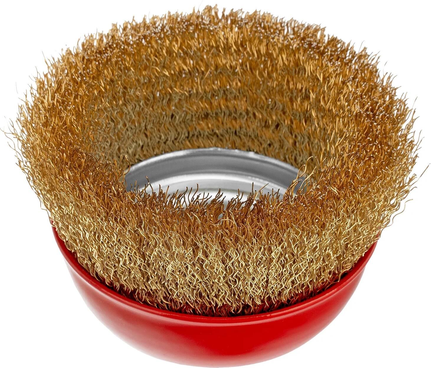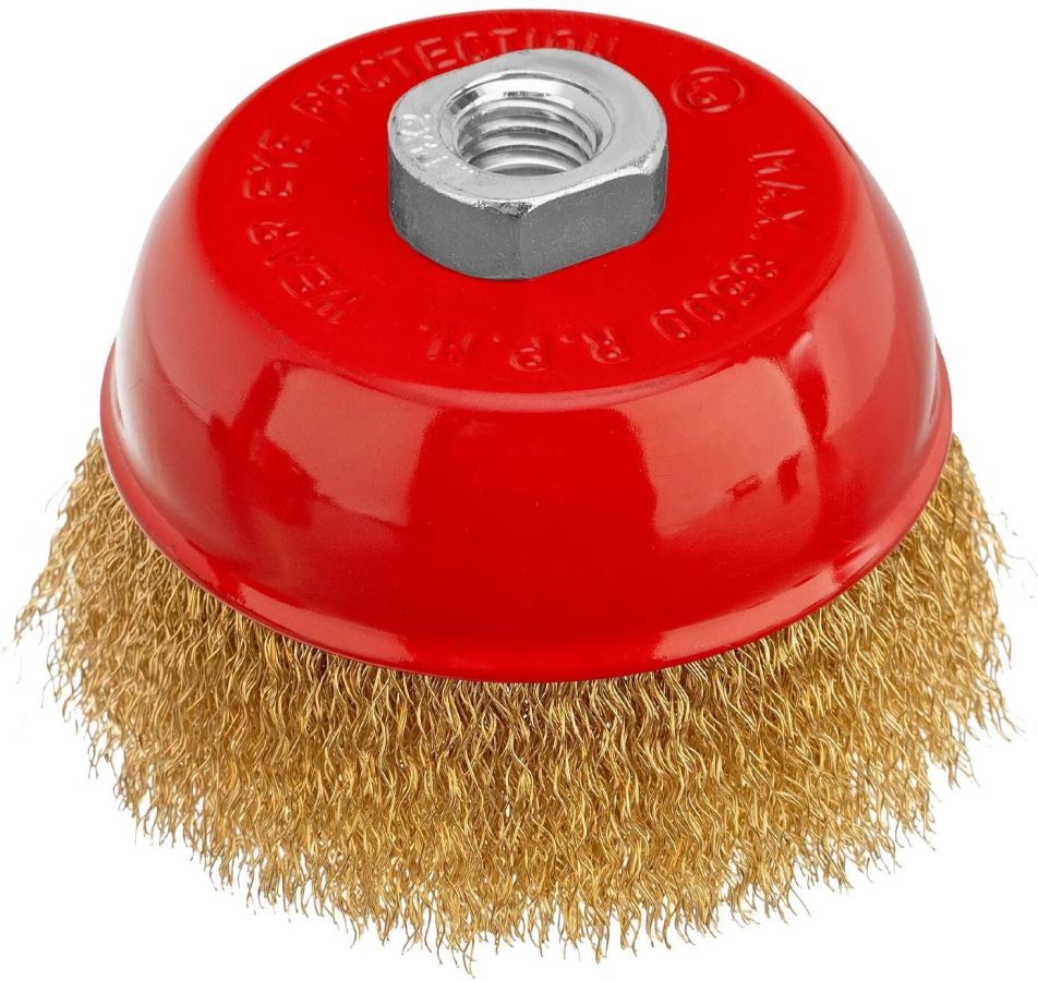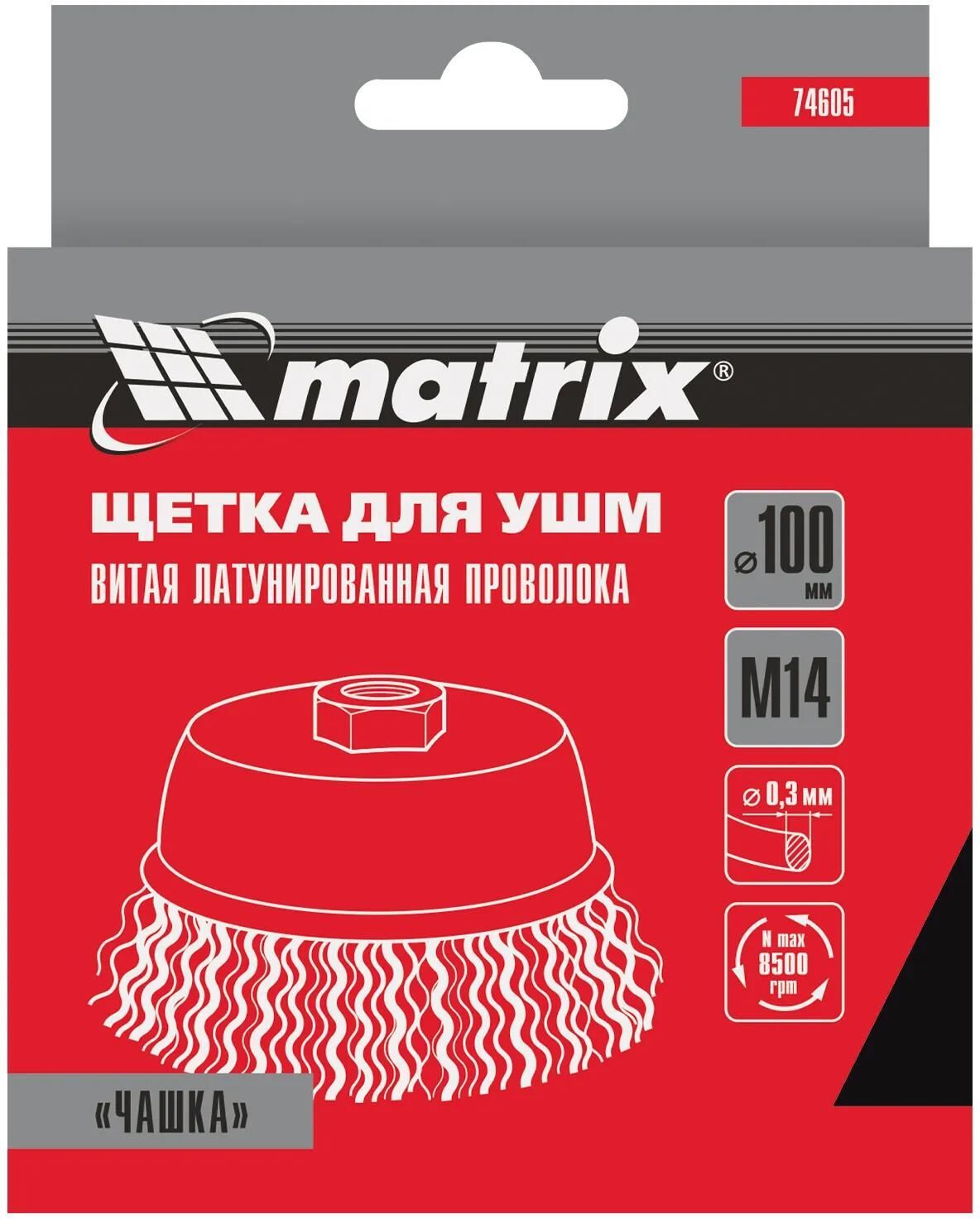 Щетка «чашка» Matrix 74605 диаметром 100 мм, с щетиной из латунированной витой проволоки, устанавливается на вал УШМ с помощью гайки М14. Предназначена для снятия тонкого слоя краски или лака, удаления ржавчины и загрязнений. При рекомендованной скорости вращения 8500 об/мин щеткой можно быстро обрабатывать участки большой площади.