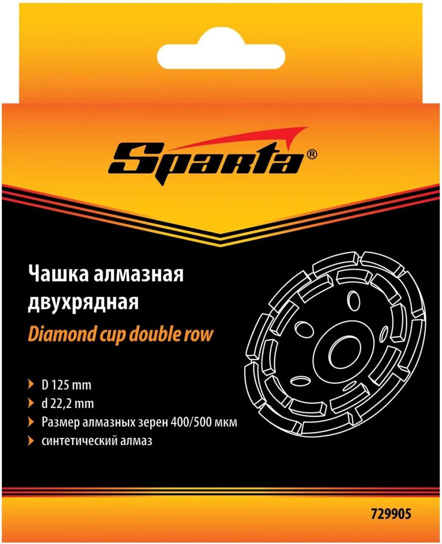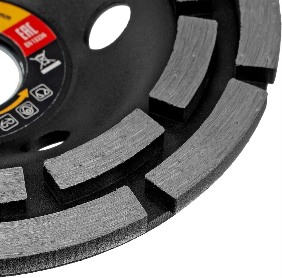 Двухрядная алмазная зачистная чашка Sparta 729905 с посадочным отверстием 22,2 мм используется с углошлифовальными машинами, совместимыми с оснасткой диаметром 125 мм. Применяется для грубой обработки бетонных, мраморных, гранитных, каменных и кирпичных поверхностей. Эффективно зачищает стыки и швы, устраняет крупные дефекты, удаляет наплывы, снимая толстый слой материала. Алмазные сегменты расположены в 2 ряда, что в сочетании с толщиной рабочего слоя 4,5 мм обеспечивает высокую производительность.