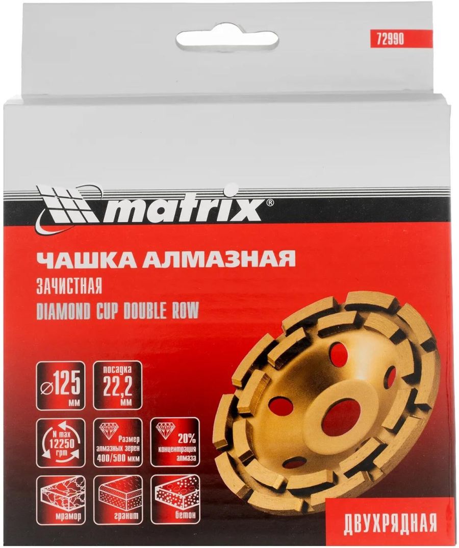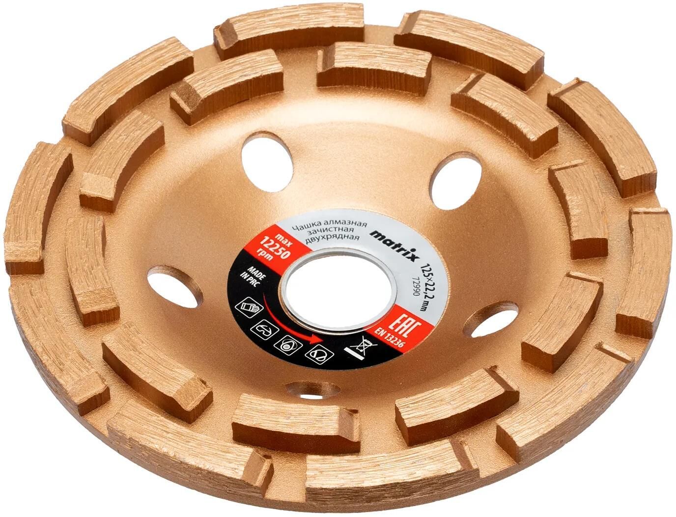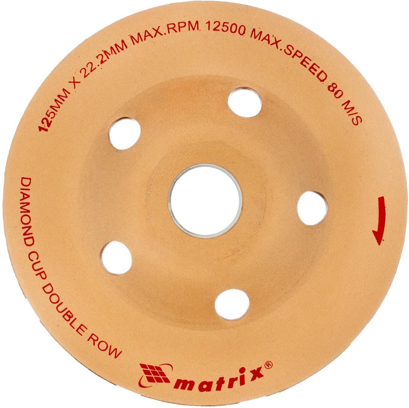 Двухрядная алмазная зачистная чашка Matrix 72990 диаметром 125 мм, с посадочным отверстием 22,2 мм, — оснастка для углошлифовальных машин, предназначенная для грубой обработки бетонных, каменных, кирпичных, мраморных и гранитных поверхностей. Позволяет проводить зачистку швов, стыков, неровностей, удаление наплывов. Придает поверхности шероховатость для улучшения ее адгезивной способности перед нанесением строительных растворов.