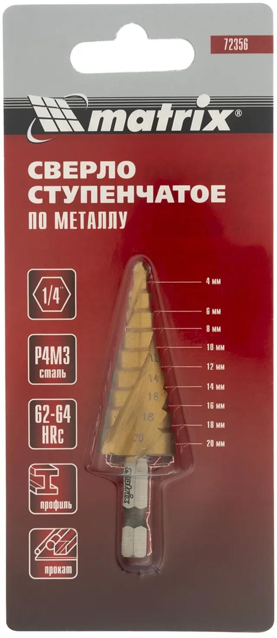 Ступенчатое сверло Matrix 72356 из стали HSS, со спиральным профилем и шестигранным хвостовиком, позволяет получать отверстия различного диаметра: 4-6-8-10-12-14-16-18-20 мм. Его можно использовать для работы с материалами толщиной до 5 мм: стали, цветных металлов, нержавейки и пластика.