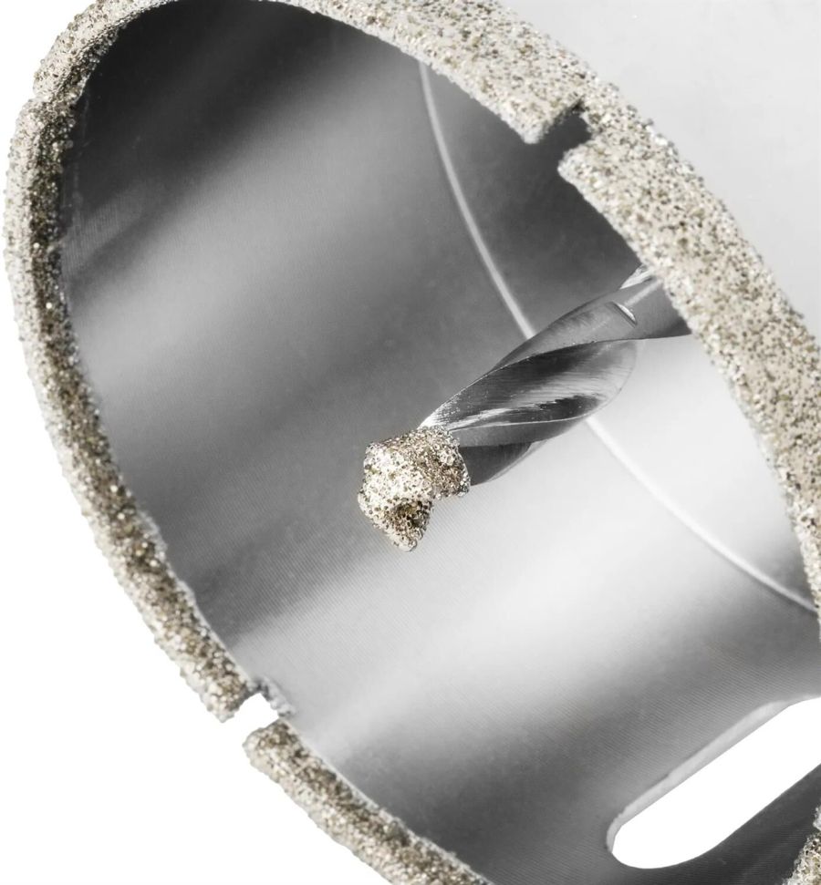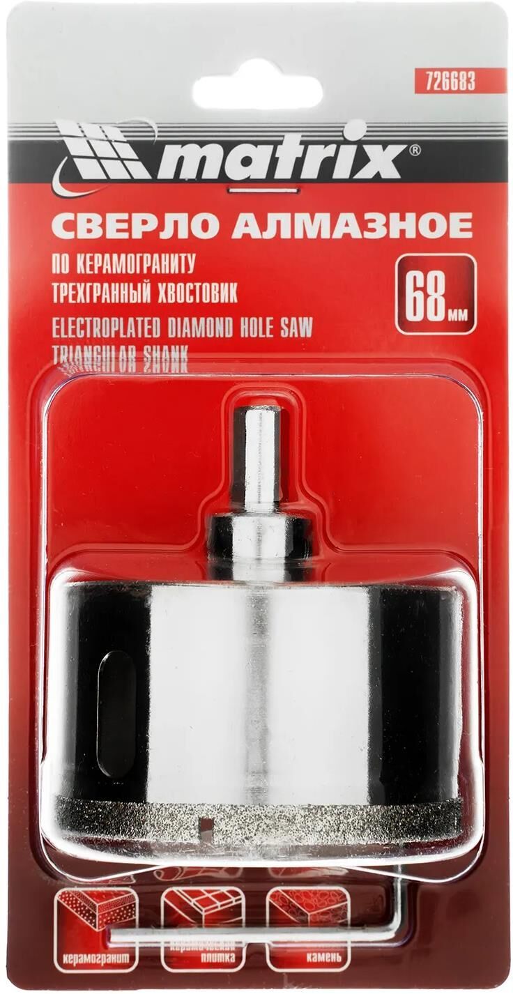 Универсальное алмазное сверло по керамограниту Matrix 726683 размером 68 х 67 мм, с 3-гранным хвостовиком, применяется для получения отверстий в стекле, плитке, кафеле. За счет высокой концентрации алмазов в режущем слое оно легко справляется со сверлением керамогранита.