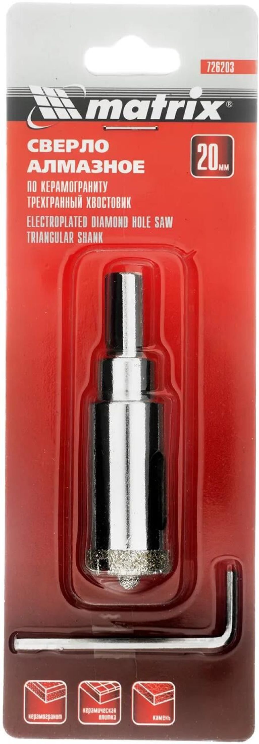 Универсальное алмазное сверло по керамограниту Matrix 726203 размером 20 х 67 мм, с 3-гранным хвостовиком, применяется для получения отверстий в стекле, плитке, кафеле.