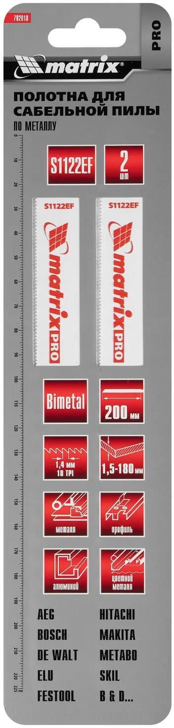 Полотна по металлу Matrix PRO 782010, S1122EF, с рабочей длиной 200 мм и шагом зубьев 1,4 мм, Bimetal, — оснастка для сабельной пилы. Позволяют работать с листовым металлом, в том числе цветным, а также с трубами и алюминиевыми профилем толщиной до 180 мм.