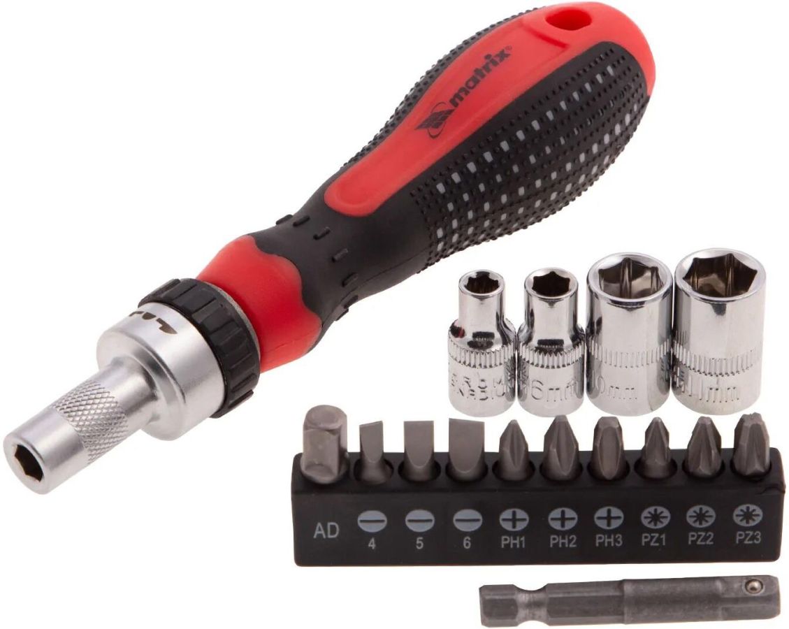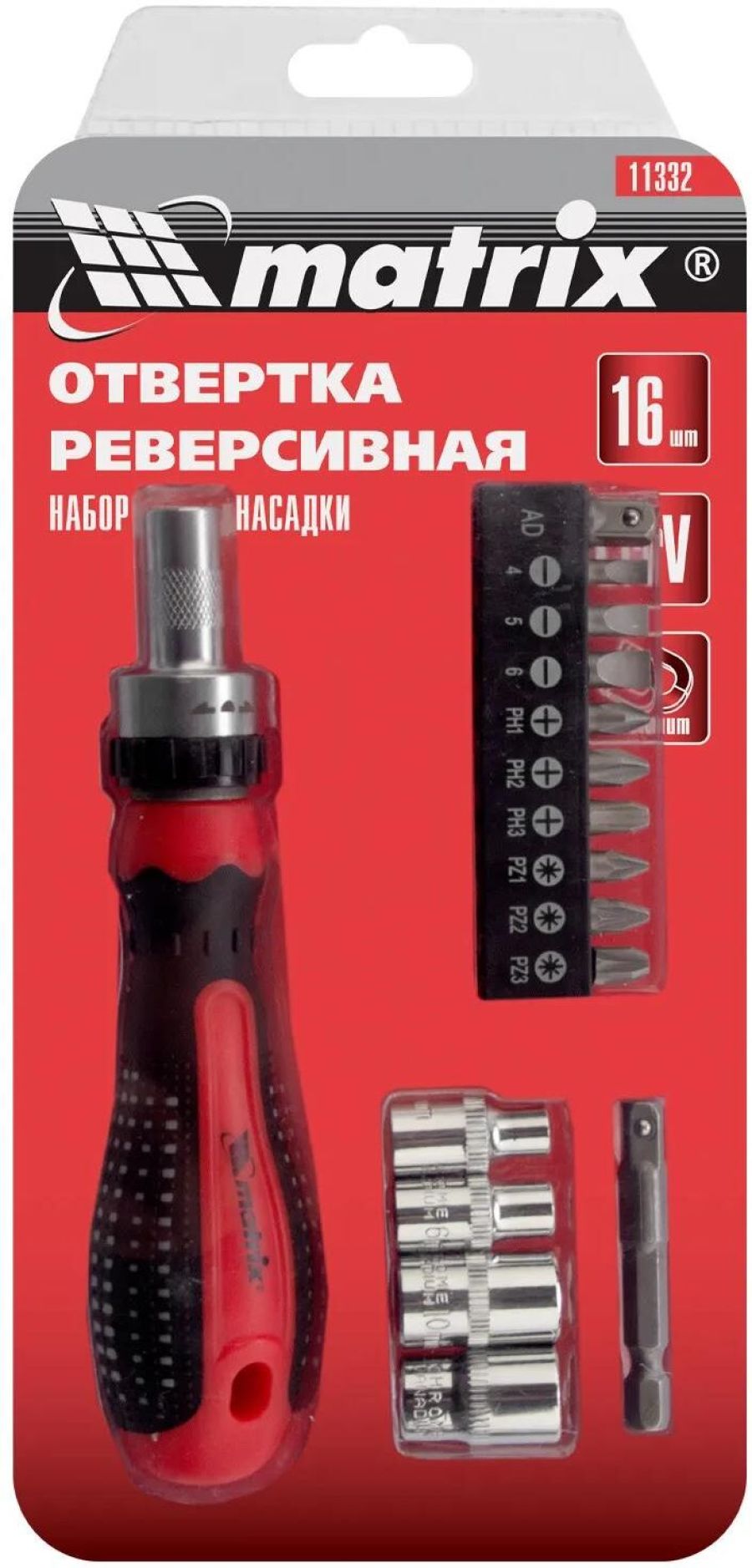 Реверсивная отвертка Matrix 11332 с набором бит и торцевых насадок из стали CrV, с присоединительным размером 1/4", 16 шт. в упаковке, предназначена для работ с резьбовыми соединениями. Благодаря торцевым головкам с адаптером может использоваться в качестве накидного ключа. Храповой механизм облегчает вращение отвертки и увеличивает скорость работы. Направление вращения можно менять при помощи кольцевого переключателя.
