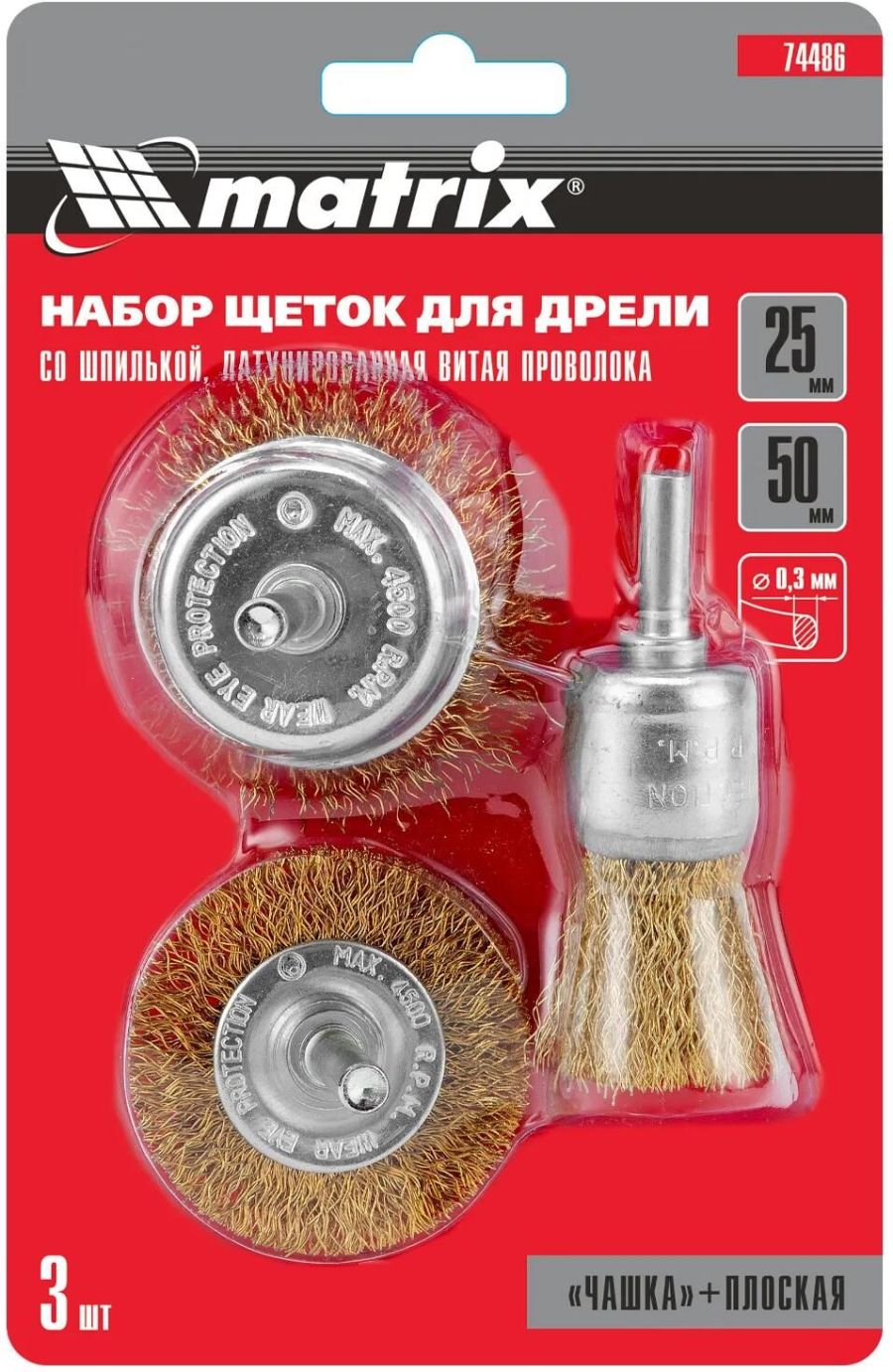 Набор щеток для дрели Matrix 74486 включает 3 насадки со шпильками 6 мм: одну плоскую диаметром 50 мм и две «чашки» диаметром 25 и 50 мм.