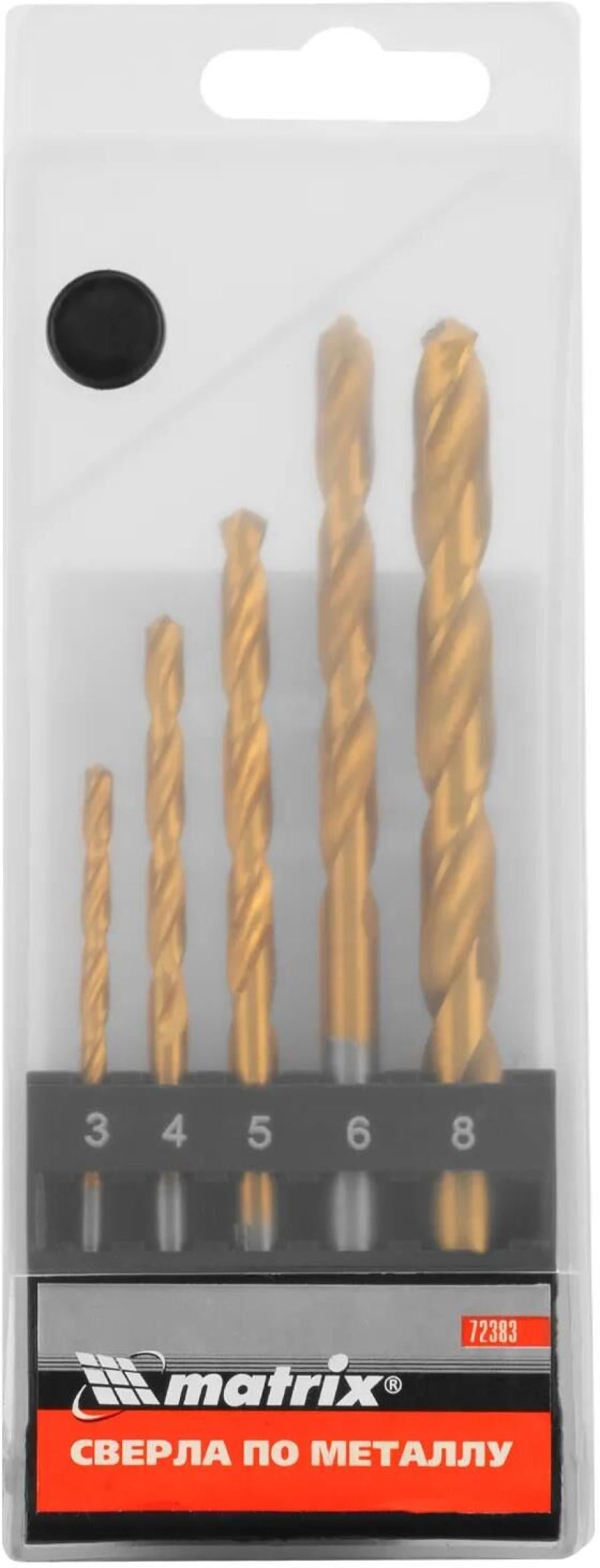 Набор Matrix 72383 включает 5 нитридтитановых сверл из стали HSS, с цилиндрическим хвостовиком, упакованных в пластиковую коробку, которые используются для получения в металле отверстий диаметром 3-4-5-6-8 мм.