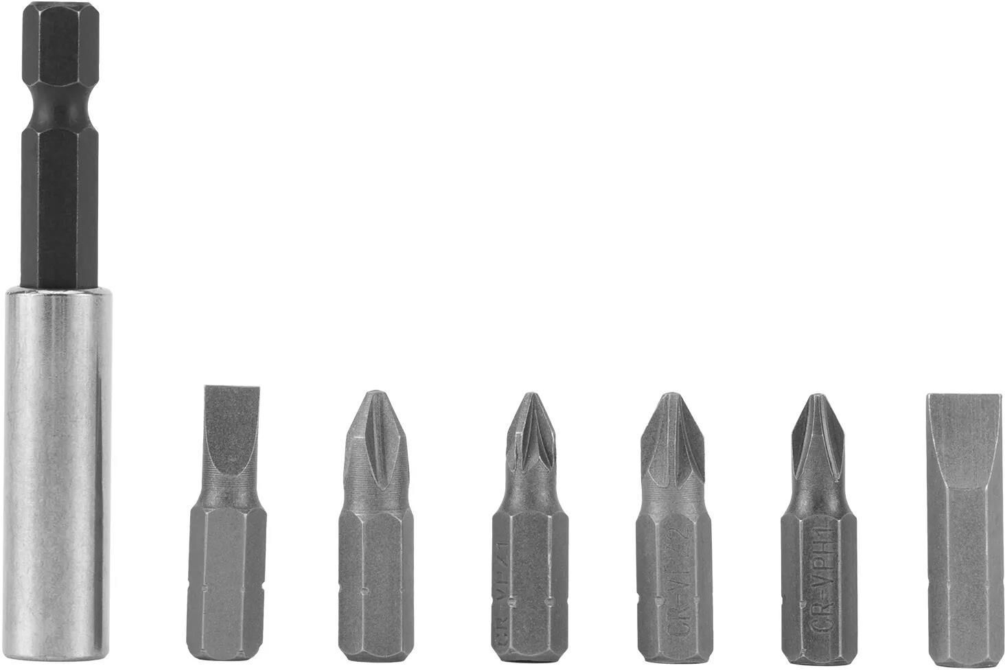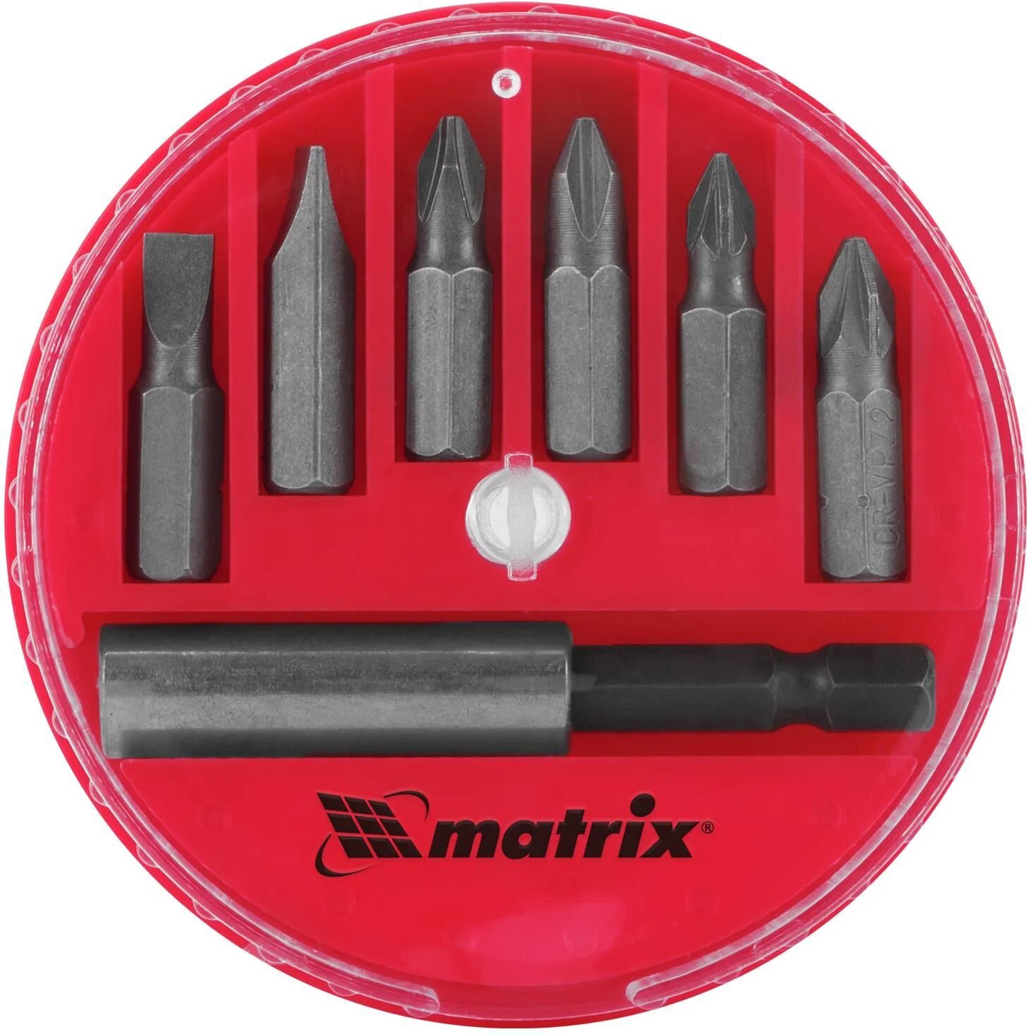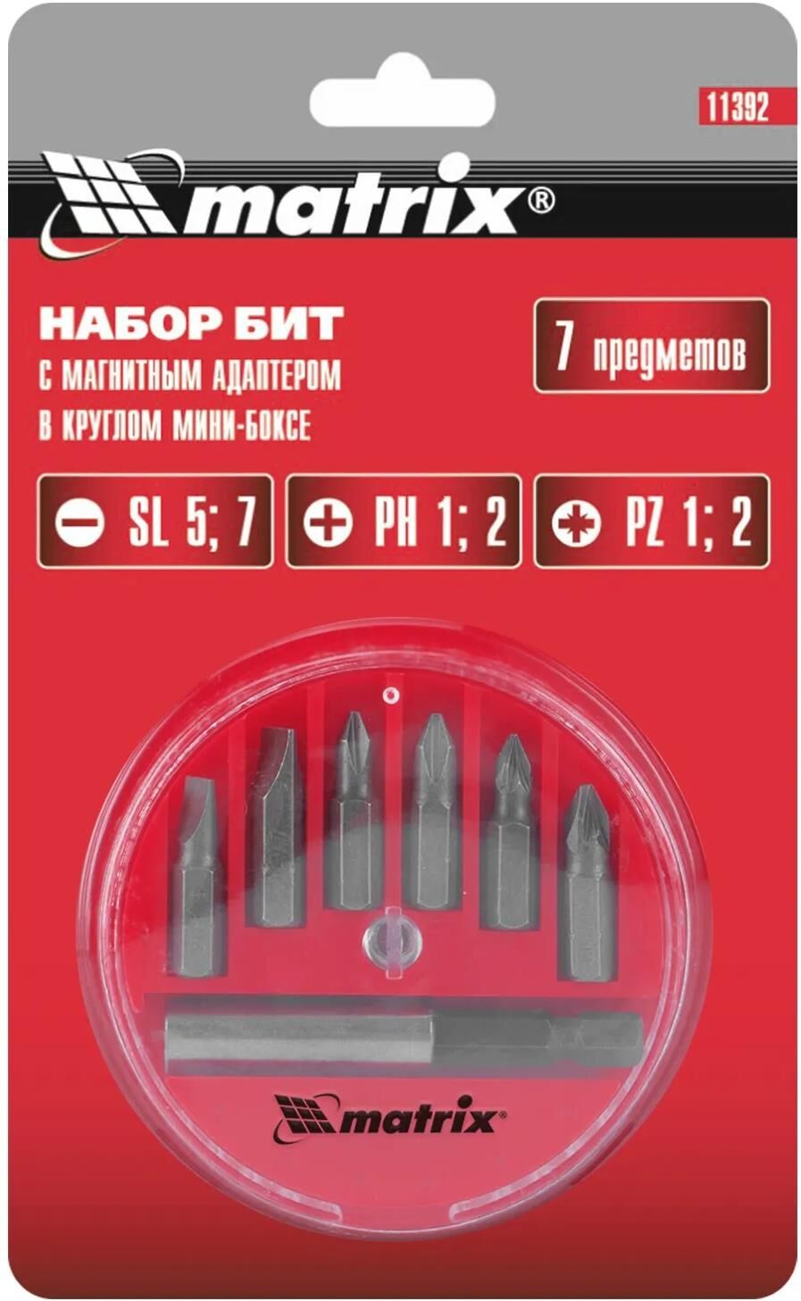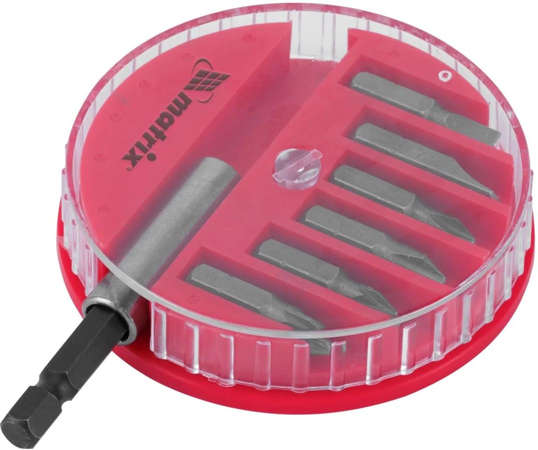 Набор Matrix 11392 поставляется в пластиковом закрытом боксе и состоит из 7 предметов: 6 бит из стали 45X со шлицами SL, PH, PZ и магнитного адаптера. Предназначен для шуруповертов, ручных и электрических отверток.