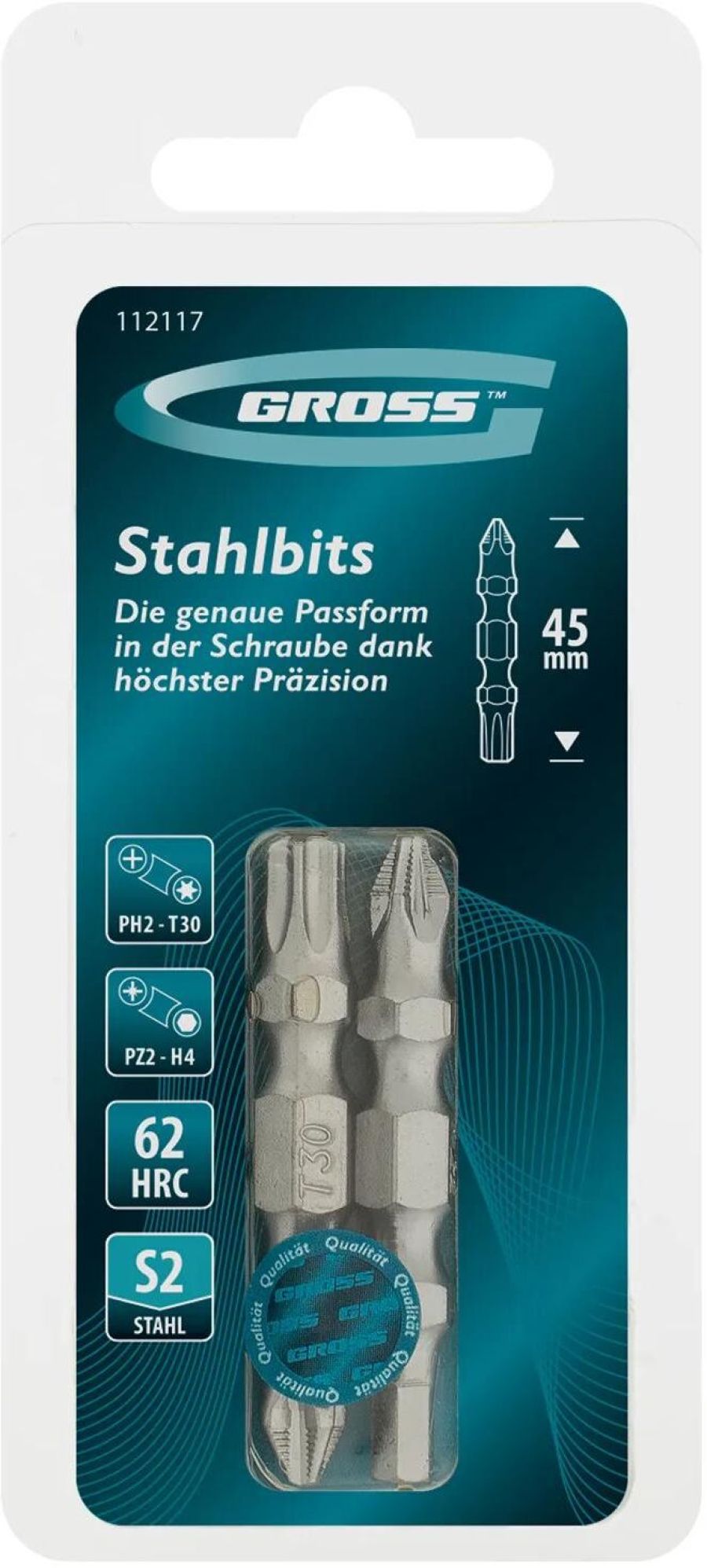 Набор двусторонних бит Gross 112117 состоит из насадок PH2-T30 х 45 мм и PZ2-H4 х 45 мм, изготовленных из стали S2. Предназначен для закручивания/откручивания саморезов по дереву и другого резьбового крепежа с помощью шуруповерта.