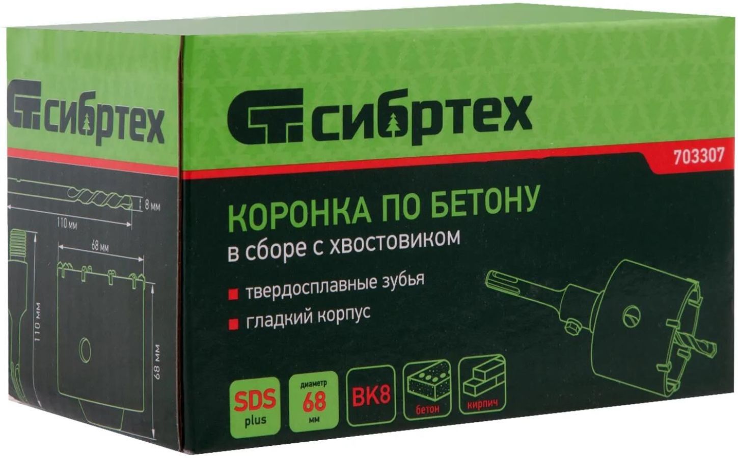 Коронка по бетону М22 х 68 мм Сибртех 703307 в сборе с хвостовиком устанавливается на ударную дрель или перфоратор с патроном SDS PLUS.
