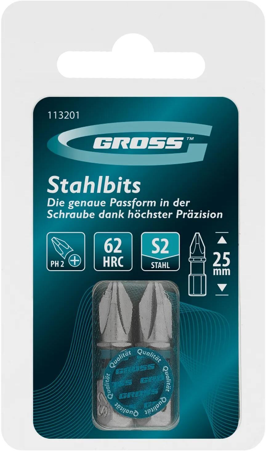 Биты PH2 х 25 мм Gross 113201 с шестигранным хвостовиком 1/4″, из стали S2, используются с шуруповертами и отвертками-адаптерами.