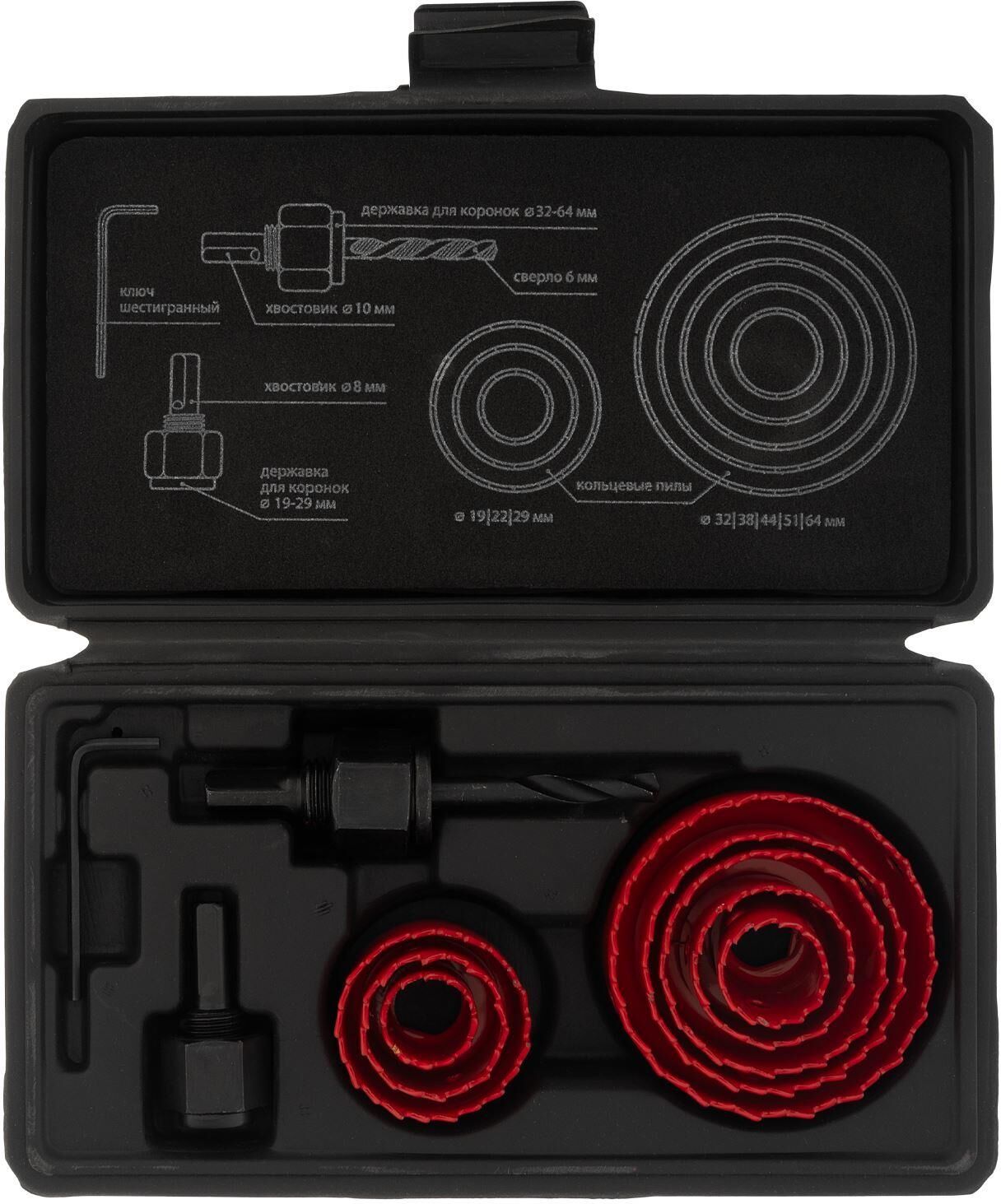 Набор кольцевых пил по дереву Matrix 70473 состоит из 11 предметов и предназначен для вырезания круглых отверстий диаметром 19-64 мм и глубиной до 27 мм. Входящие в комплект коронки подходят для работы по дереву, фанере, пластику, ламинату, гипсокартону, ДСП. Позволяют подготовить поверхность к установке розеток, светильников, выключателей, а также прокладке труб. Коронки устанавливают на электродрель. Набор пригодится во время ремонта и будет полезен в быту. Преимущества Прочность и износостойкость — кольцевые пилы изготовлены из углеродистой стали, режущие кромки твердостью 40 HRC долго сохраняют остроту. Высокая производительность — разведенные зубья обеспечивают эффективное удаление стружки. Точное центрирование пил — в набор входит направляющее сверло, для его фиксации предусмотрен шестигранный ключ размером 2,5 мм. Удобное хранение и транспортировка — набор упакован в пластиковый кейс с ложементом.