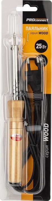 Электрический паяльник с деревянной ручкой и конусообразным жалом непрерывного нагрева предназначен для монтажной пайки и лужения оловянно-свинцовыми припоями элементов радиоэлектронной аппаратуры и тонкостенных металлических изд-й в производственных и бытовых условиях. Перед началом эксплуатации электрического паяльника паяльное жало следует подвергнуть лужению. тех инфо: Uвх: 220-230 В 50/60 Гц Pпотр: 25 Вт Длина провода: 1.35 м Масса: 0,13 кг