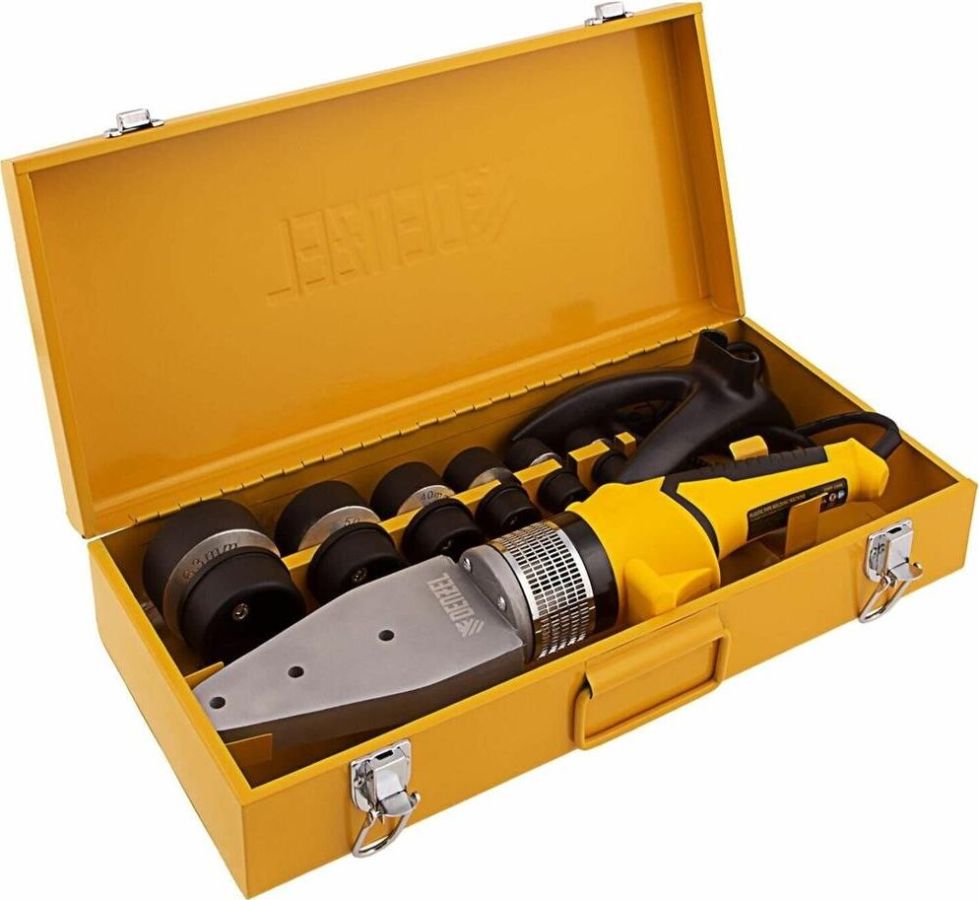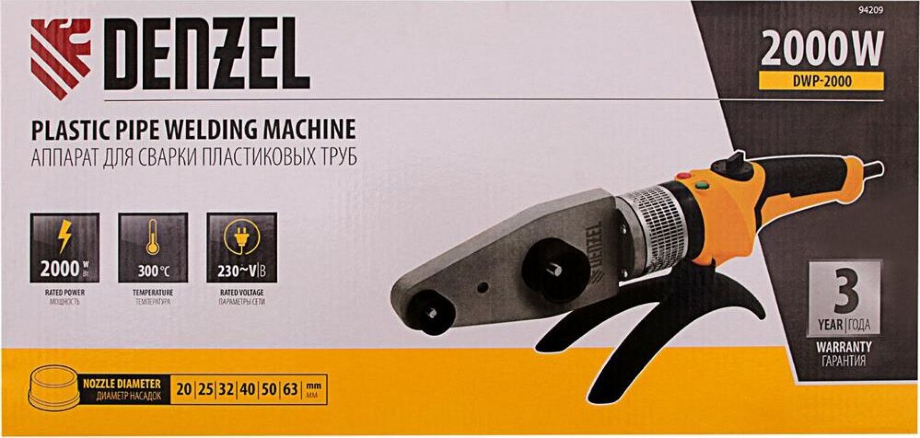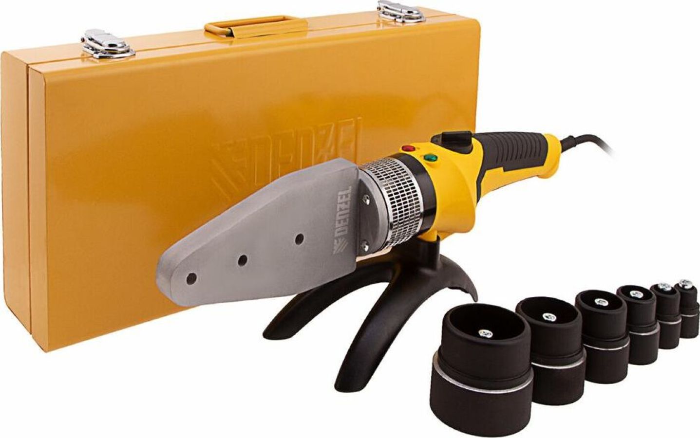 Аппарат для сварки (пайки) пластиковых труб торговой марки DENZEL предназначен для прочного соединения труб из полипропилена и полиэтилена в домашних условиях. Технологический процесс заключается в нагреве/размягчении двух монтажных компонентов и соединении их под давлением. Технические возможности аппарата DENZEL позволяют регулировать температуру нагрева изделий до 260 300 °С. Применение сменных насадок позволяет соединять трубы диаметром от 20 до 63 мм. Насадки имеют тефлоновое покрытие, предупреждающее налипание пластика к их поверхности.