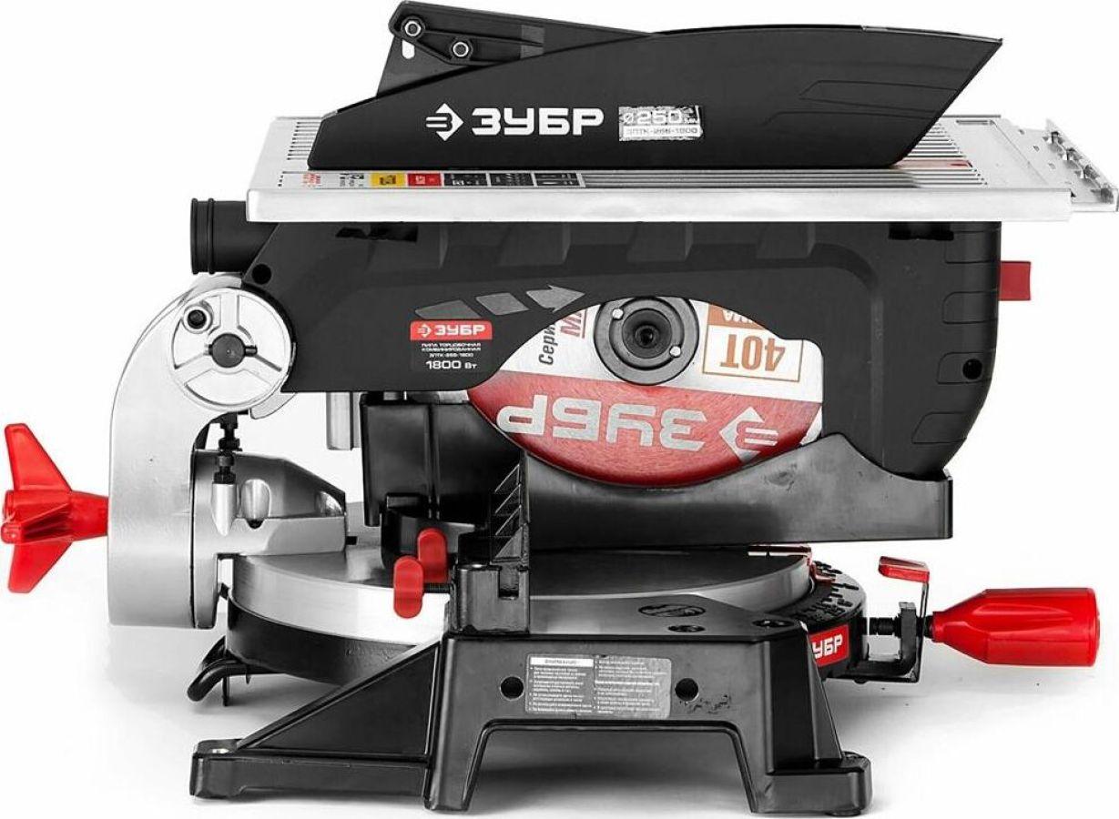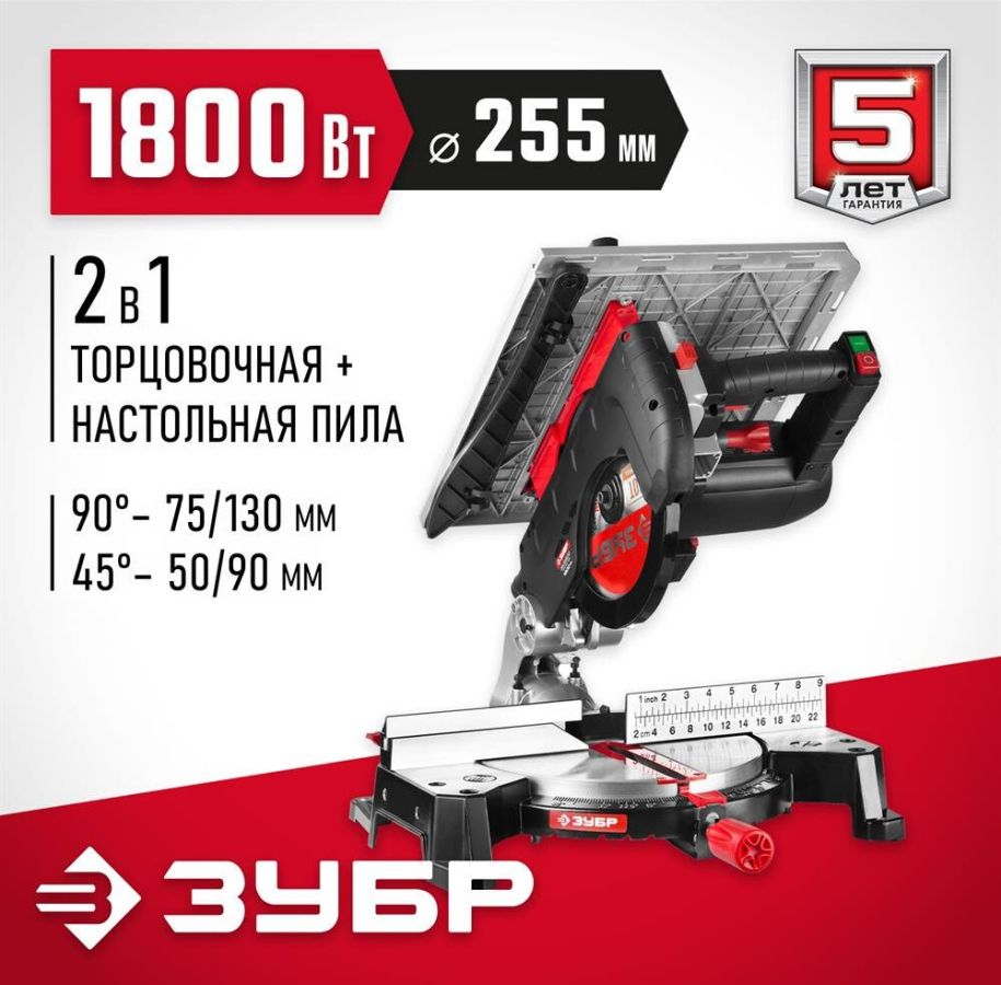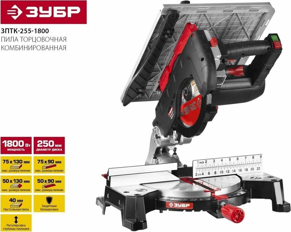 Торцовочная пила Зубр МАСТЕР ЗПТ-255-1800 ПЛ применяется для прямого, косого и комбинированного пиления, а также пиления под наклоном. Подходит для резки таких материалов, как древесина, пластик, тонкостенный алюминий. Лазерная подсветка линии реза позволяет увеличить точность пропила. Благодаря сдвижной голове и диску большого диаметра достигается увеличенная ширина реза. Фиксирующийся в любом положении поворотный стол и удобная регулировка наклона облегчают установку угла пиления. Наличие лазера. Габариты, мм 790x480x400. Длина кабеля, м 2. Мощность, Вт 1800 .Вес, кг 13 Max ширина пропила под углом 90°, мм 130. Max ширина пропила под углом 45°, мм 210. Max глубина пропила под углом 90°, мм .90 Max глубина пропила под углом 45°, мм 55. Диаметр диска, мм 255 .Посадочный диаметр диска, мм 30. Тип двигателя щеточный .Горизонтальное перемещение.