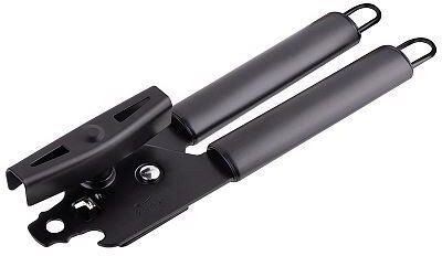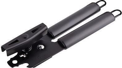 Нож консервный CLASSICO NERO из нержавеющей стали, цвет - черный, non-stick (раб часть) Материал: ручка из нерж стали, раб часть - железо, лезвие из нерж стали, размер: 20*5*4,4 см. картонная подложка. Овальная ручка.