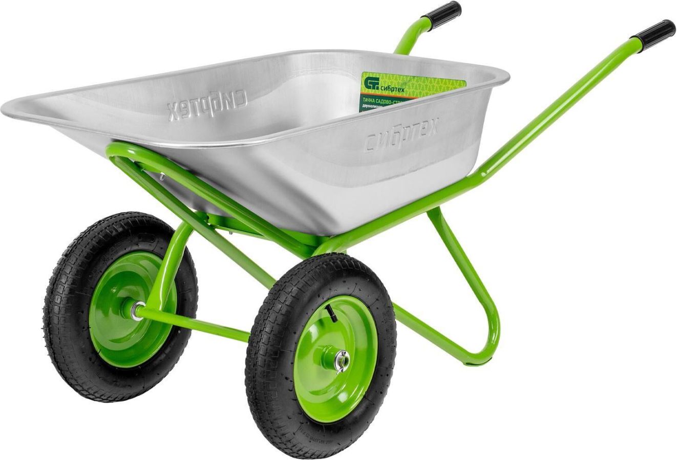 Садово-строительная двухколесная тачка Сибртех 689648 грузоподъемностью 230 кг, с кузовом объемом 110 л, предназначена для транспортировки тяжелых грузов. Подходит для перемещения сыпучих материалов (песка, цемента, гравия и т.д.), вывоза строительного и садового мусора, а также для перевозки грунта, дерна, мульчи и других грузов. 2 пневматических колеса обеспечивают плавность хода и устойчивость нагруженной тачки. Тачка незаменима на строительной площадке, дачном участке, складе. Преимущества Надежная конструкция — рама диаметром 32 мм и опора диаметром 25 мм изготовлены из стальной трубы с толщиной стенки 1 мм, поэтому тачка выдерживает нагрузку до 230 кг. Устойчивость к деформации — толщина стенок кузова составляет 0,7 мм, его края завальцованы для повышения ударопрочности. Защита от разрушения — цинковое покрытие предохраняет кузов от образования коррозии.