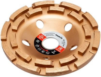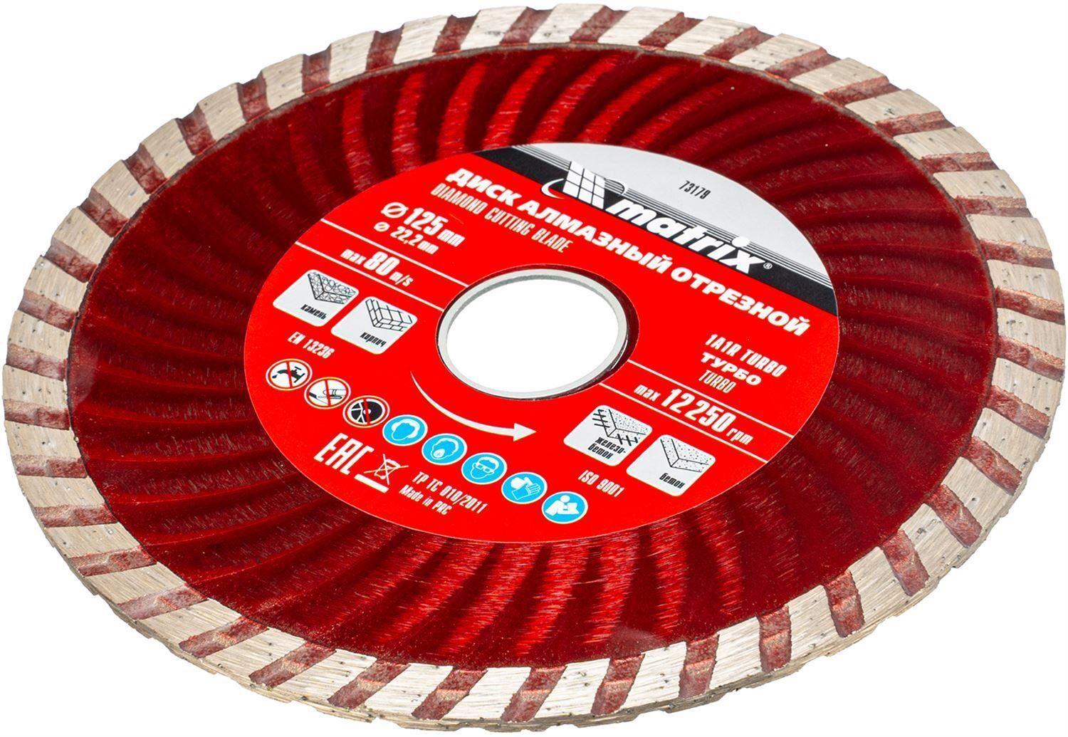Отрезной алмазный диск Matrix Turbo 73179, 125 х 22,2 мм, сухая резка, является сменной оснасткой для углошлифовальных машин (УШМ). Он используется для ремонта и мелкого строительства, а также при решении бытовых задач. Диск предназначен для работ по бетону, в том числе свежему и среднеармированному, камню или кирпичу.ПреимуществаТурбированная рабочая часть обеспечивает интенсивное охлаждение и отвод пыли, повышая производительность диска.Диск сделан по технологии холодного прессования, а ширина рабочей части составляет 7 мм - этого достаточно для полноценного бытового применения.Высокая концентрация алмазных зерен в сочетании с оптимально подобранной связкой обеспечивает эффективную работу даже по железобетону.Водяное охлаждение не требуется, поэтому диск можно использовать с УШМ без подачи воды.